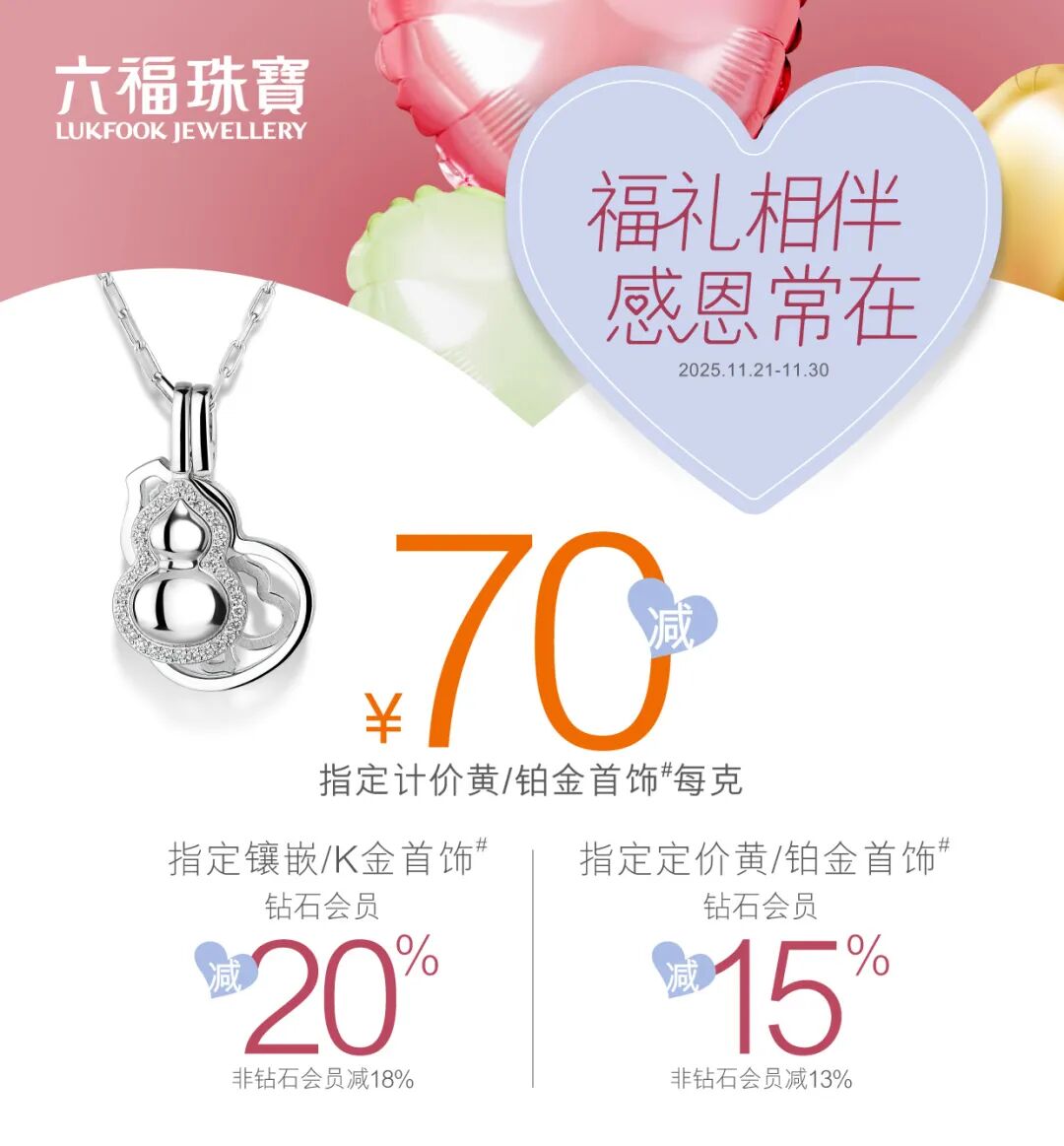 以上优惠仅适用于中国内地指定之六福珠宝实体店铺;以上折扣优惠均以商品标签价格及当天六福珠宝全国统一金价为计价基础;推广期内货品(包括且不限「唐宫」、「哪吒」系列等)、特价、授权精品、电铸摆件、金章、金条及投资金类不参与;除会员积分、会员积分抵扣计划外,不可与其他优惠同时使用;会员于推广期内任意消费即可获得兑换资格,兑换活动于2025年11月21日早上10:00于会员小程序「积分商城」上架,仅限60份,数量有限,兑完即止,每位符合条件之会员于「活动专区」内仅限兑换1次及换领1件,积分一旦扣除,不作退回,逾期未兑换视为自动放弃;首饰款式由系统随机选取,并于推文内展示;活动适用于中国内地之六福珠宝、六福精品廊、Love LUKFOOK JEWELLERY实体店铺、福满传家及Goldstyle专门店;更多详情可查阅「积分商城」内产品详情及换领细则;活动过程中,因会员退货或遇用户恶意作弊,通过其他不正当手段(包括但不限于使用三方软件或利用系统漏洞等)参与活动,本司核实情况后有权取消其参与资格,并回收用户已兑换的礼品,必要时追究法律责任;六福集团之员工均不得参与上述会员活动,以示公允;详情请向店员查询;图片仅供参考。