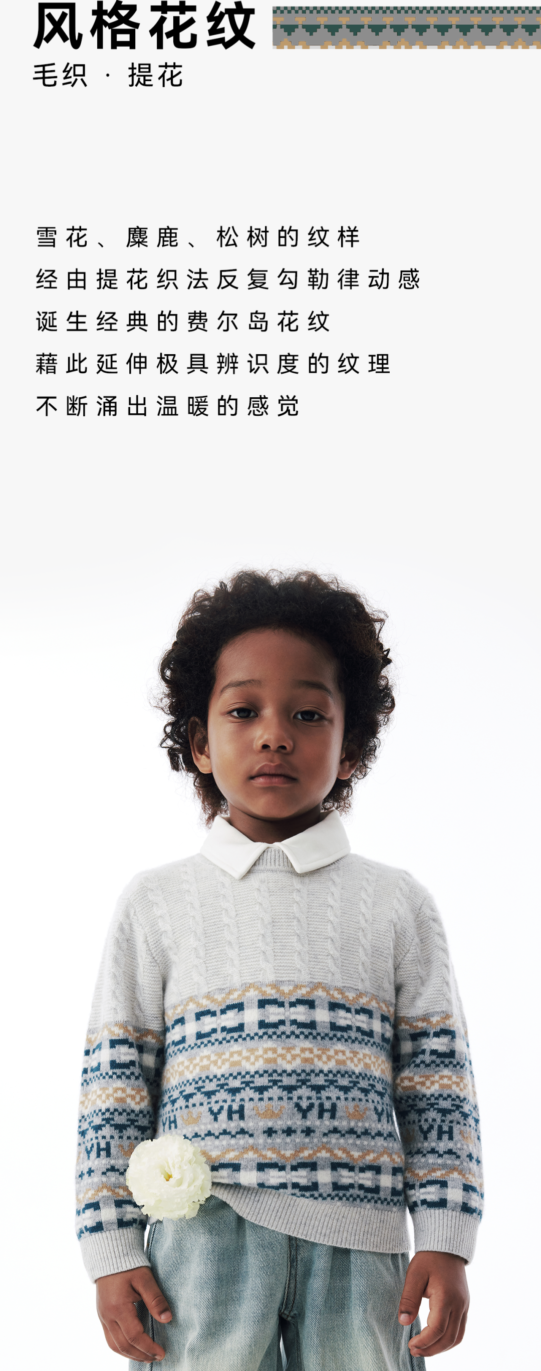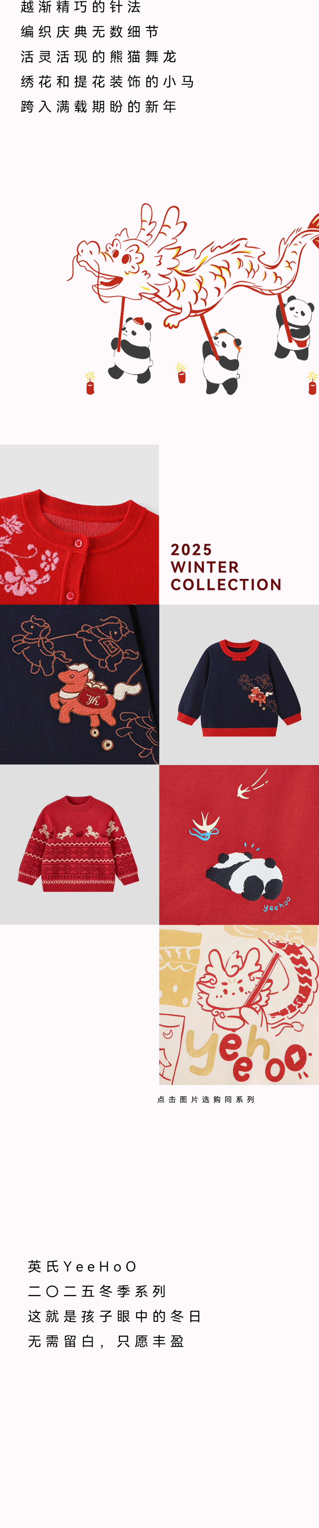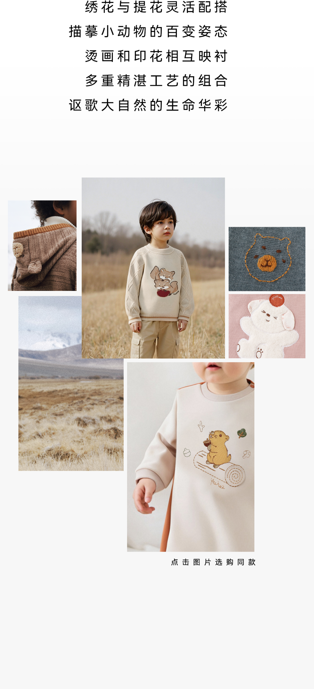 推荐:「自动逆时针旋转切换(下)」介绍儿童服装2025冬季系列,展示运用绣花、提花等工艺描绘自然动物和节日元素的童装,强调童趣与工艺。