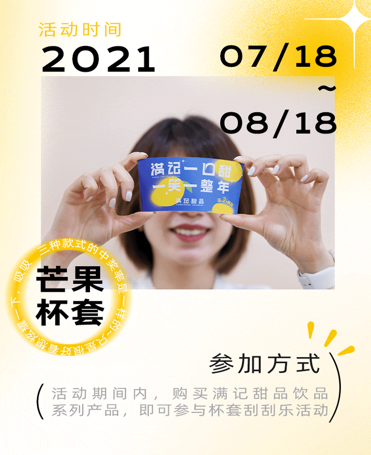 活动期间内,购买满记甜品饮品系列产品,即可参与杯套刮刮乐活动,刮开杯套涂层有机会获得iPhone12、金饭碗(全年26次免单资格)、100元代金券、再来一杯、5元代金券等惊喜好礼。
