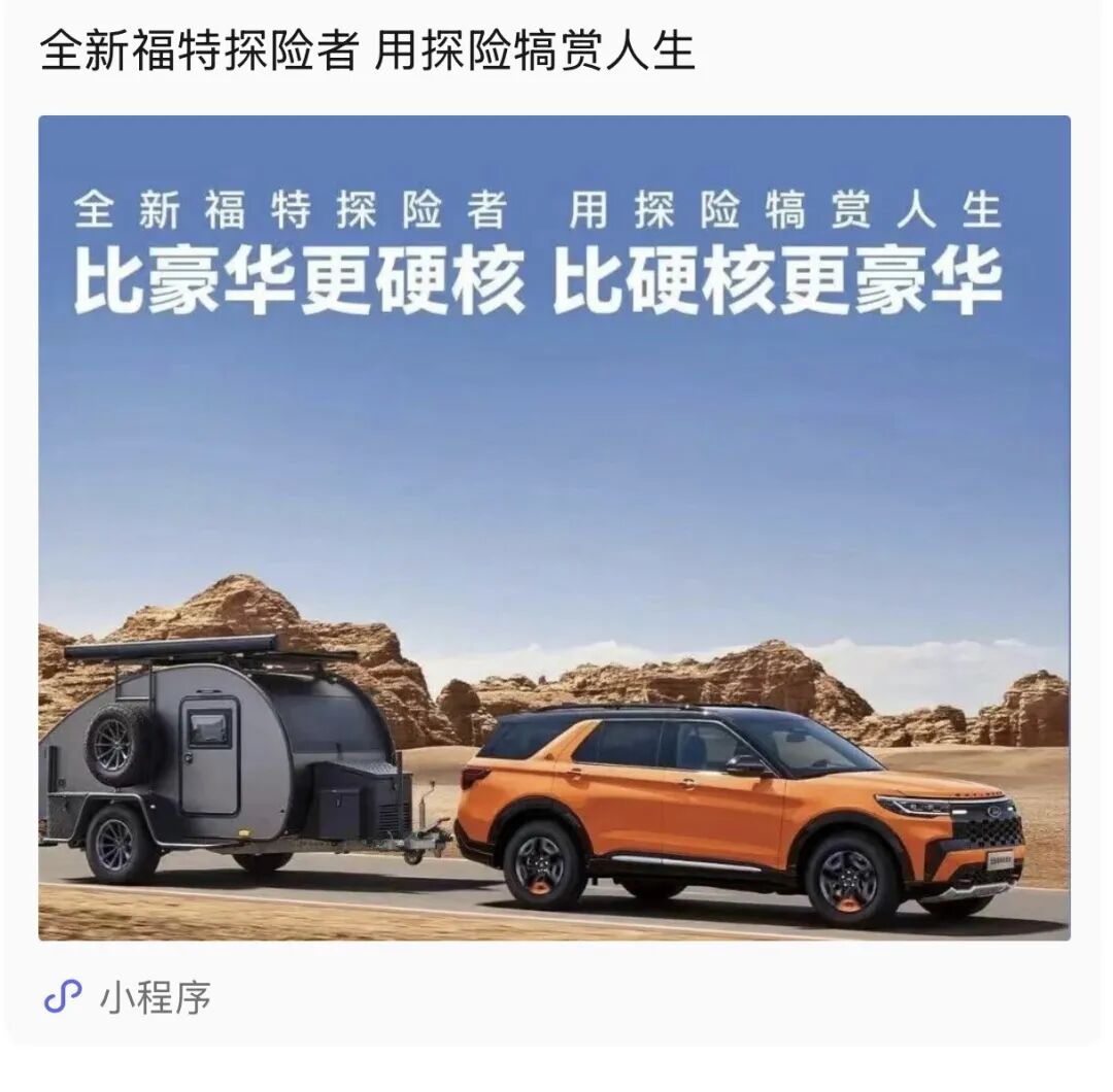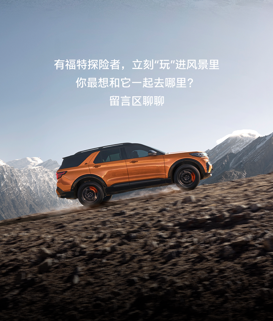 推荐:多个平级「点击切换图片」展示福特探险者车型在戈壁、沙漠、山野等场景下的越野性能与驾驶体验,突出其全系四驱、纵置后驱等配置,借此宣传福特汽车。