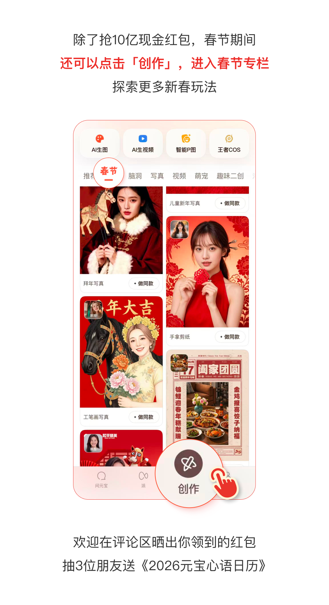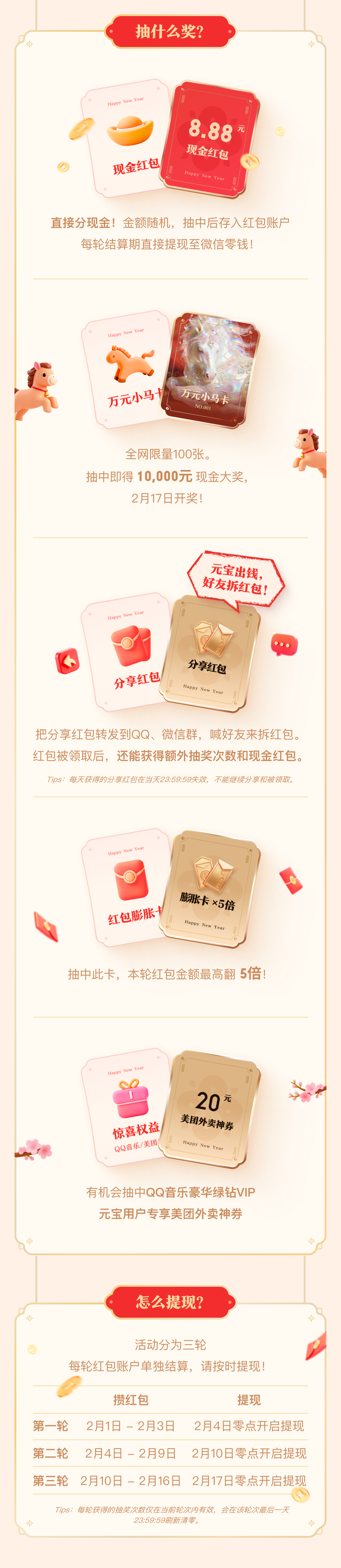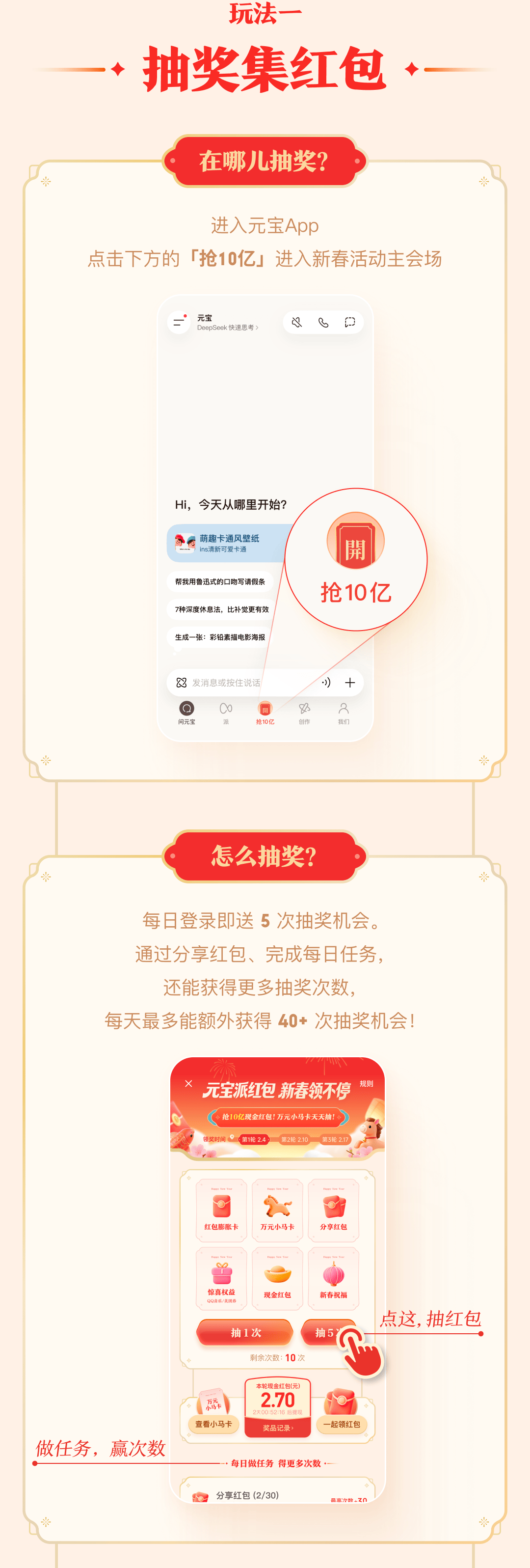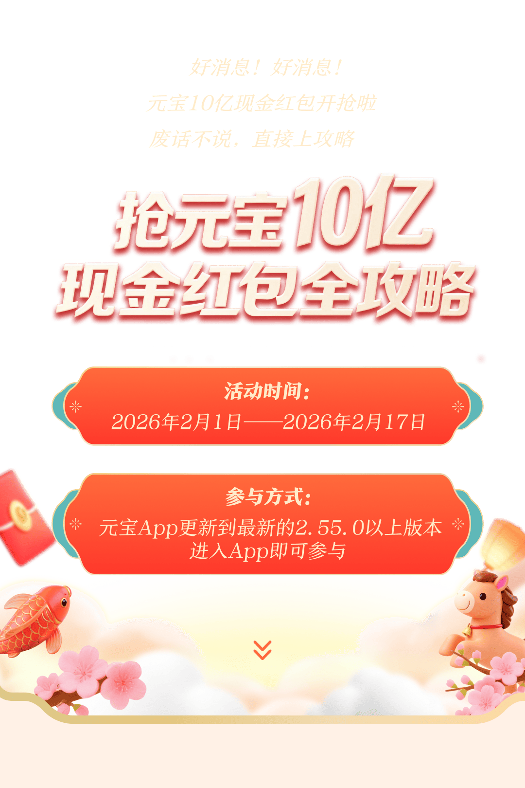 推荐:「连续点击切换GIF动图后点击展开」详细说明元宝APP抢10亿现金红包的三种玩法(抽奖集红包、祝福语红包、限时红包雨)和提现规则,借此宣传元宝。