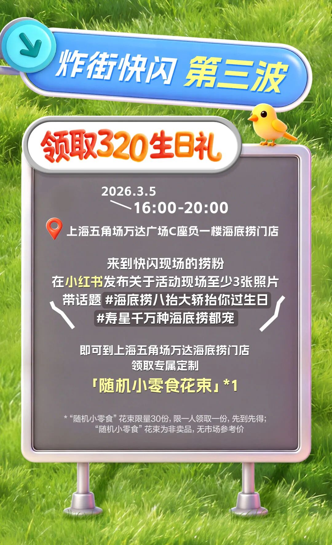 推荐:「点击消失后展开」介绍海底捞火锅3月5日举办“八抬大轿抬你过生日”活动,由IP“小捞捞”现场互动,为寿星提供生日轿、生日帽及零食花束。