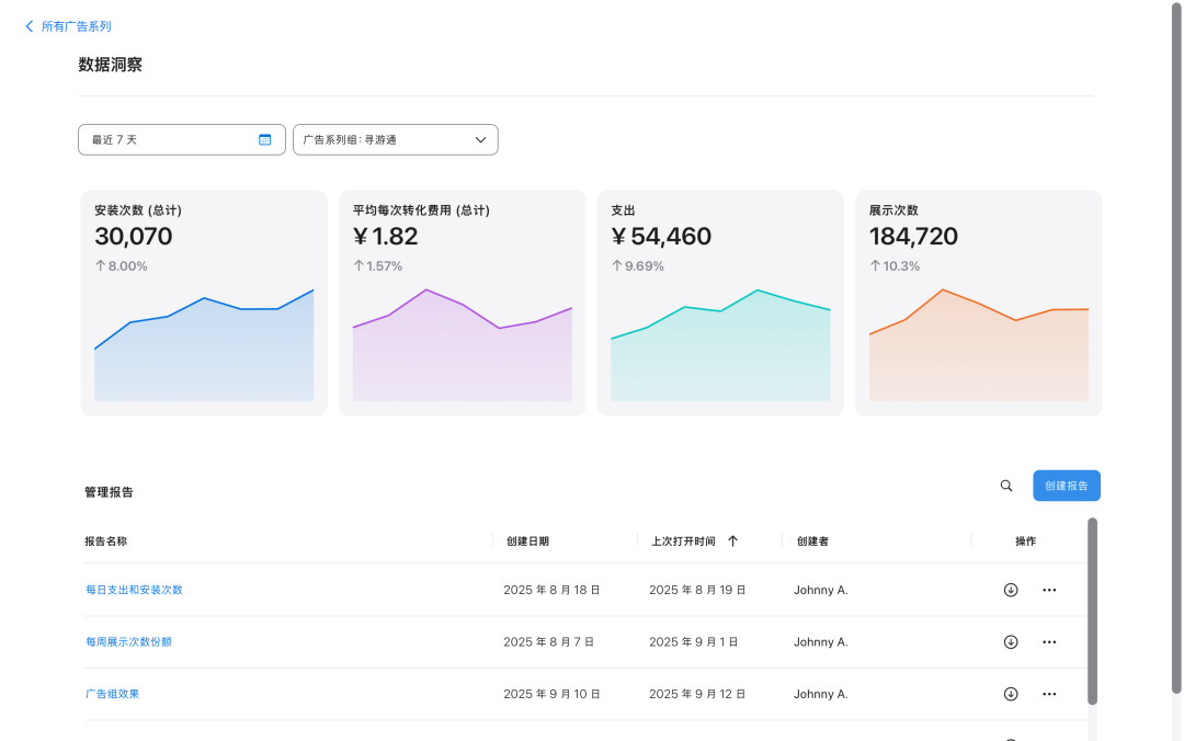 更全面的分析,更深入的洞察。 “数据洞察”现已正式上线。 你可以借助这一强大的数据分析引擎,深入探索你的 Apple Adds 广告表现。 “数据洞察”可以帮助你。 1. 探索整个账号表现。 通过图表视图,可视化地查看整个账号中不同广告系列组的数据表现。 2. 获取重要指标。 借助经浏览和预购数据指标,了解广告系列的整体价值。 3. 做出明智的关键词出价决策。 评估所有广告系列中的关键词效果,以发现增长机遇。 4. 优化展示次数份额。 借助预定义的展示次数份额报告,提升特定关键词的下载量。 立即使用“数据洞察”,做出更快、更明智的优化决策。 点击阅读原文,进一步了解“数据洞察”功能。 Apple adds 官方微信公众号可以帮助你了解产品资讯,获取 app 推广灵感,接收账号通知。你可以长按文末二维码,关注我们。 以下是本文相关注释。 “数据洞察”功能旨在帮助你优化广告系列,其不保证投放结果。