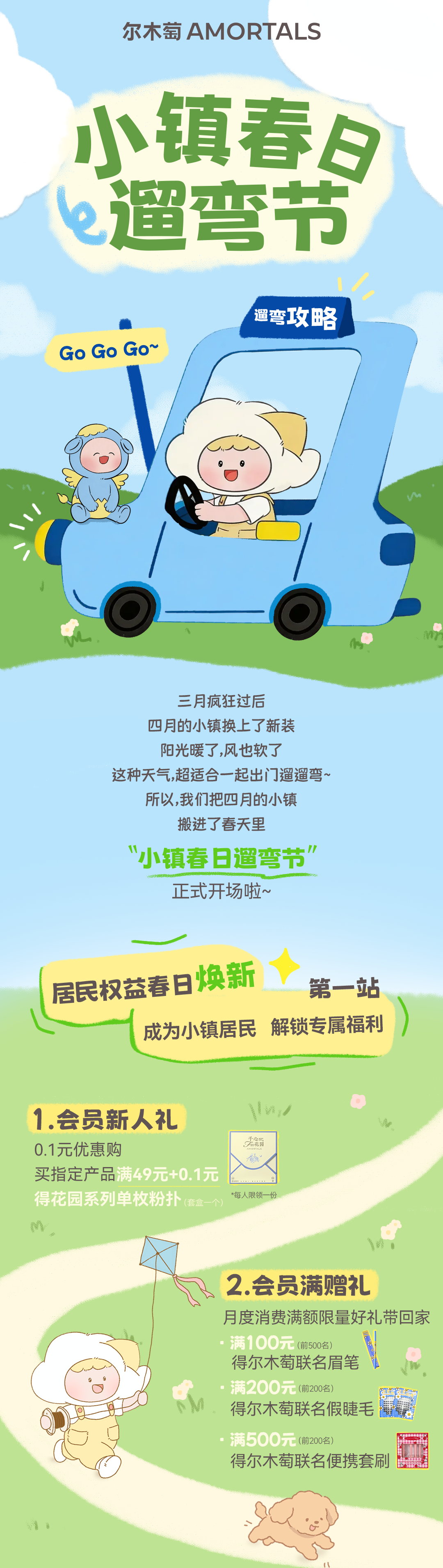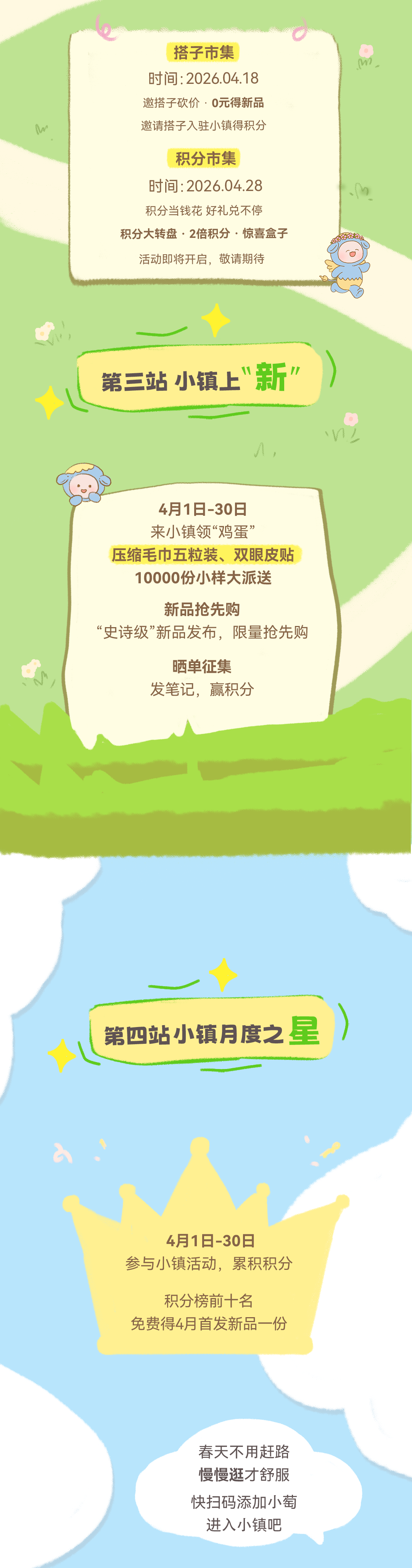 推荐:「点击消失后展开」推出“小镇春日遛弯节”会员活动,新人可0.1元购粉扑,并有限时“油皮/脆皮/出行”大礼包。