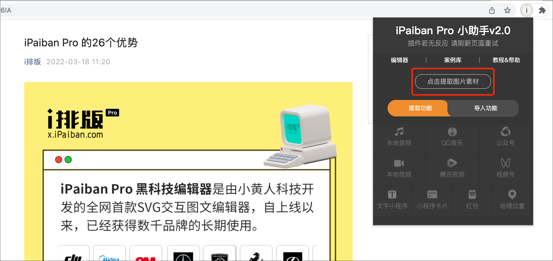 点击页面右上角 iPaiban Pro 小助手插件,选择【点击提取图片素材】