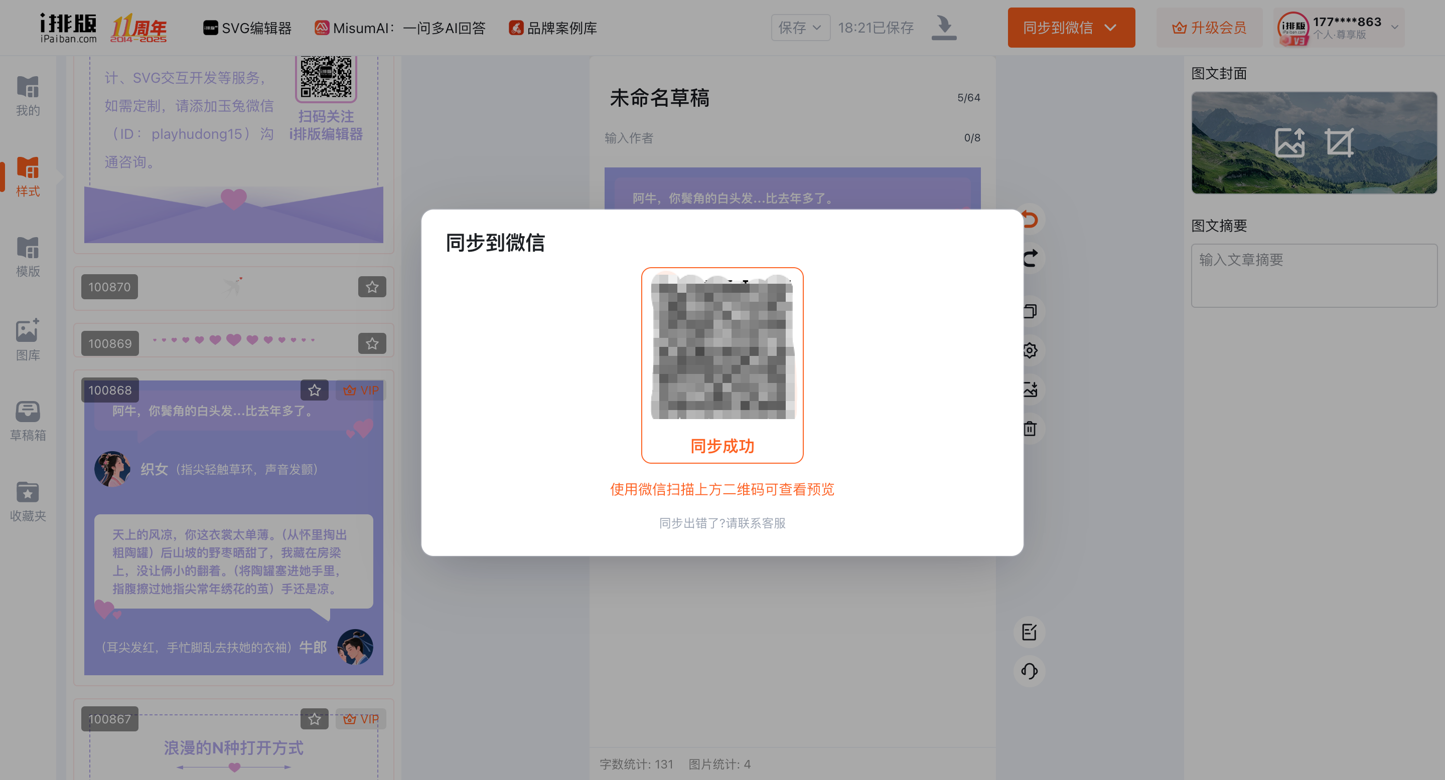 同步完成后,页面会显示同步成功后的二维码,用户可以扫描这个二维码预览文章内容