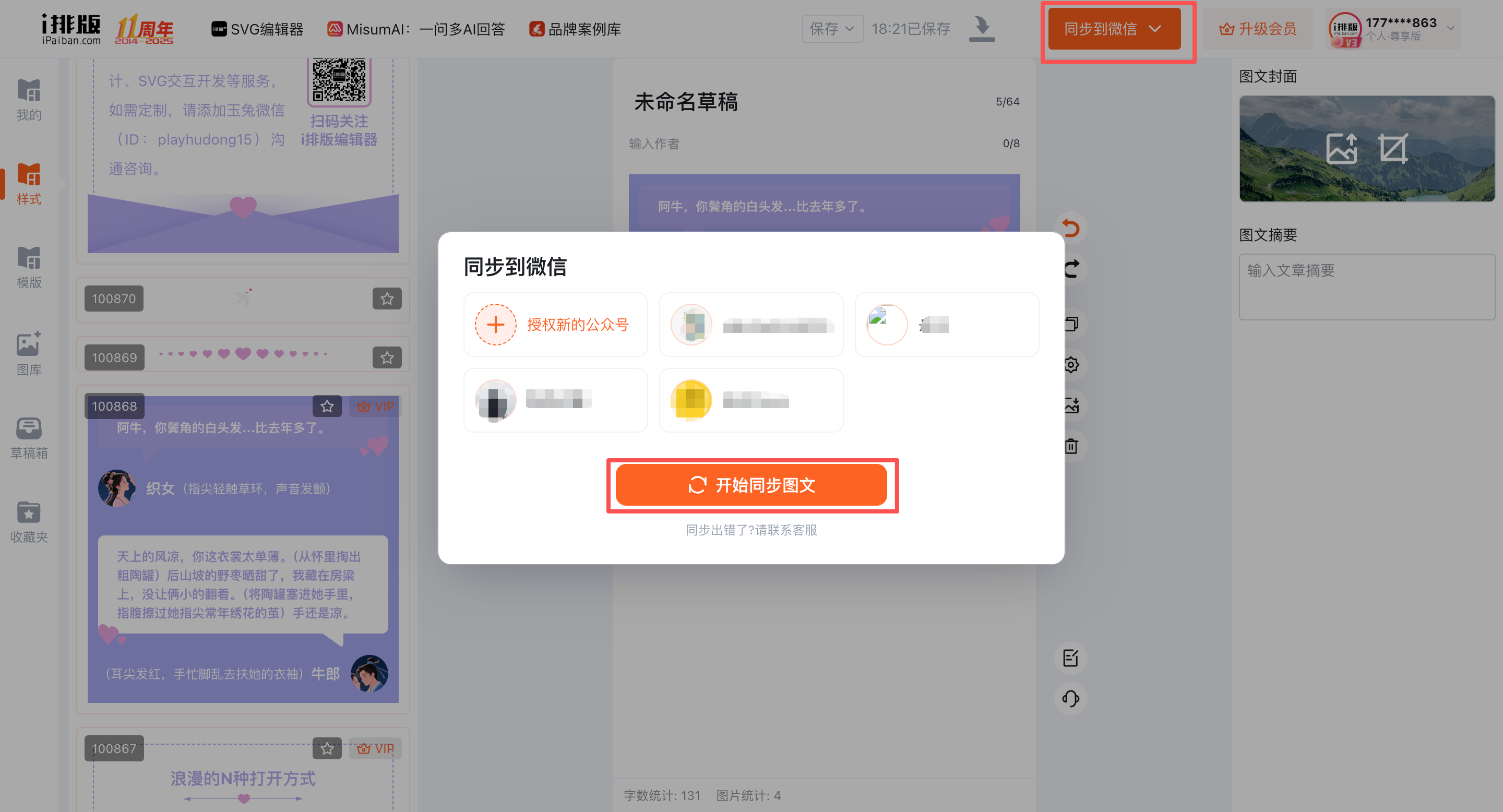 内容排版完成后,点击右上角的【同步到微信】按钮,选择需要同步的公众号后,点击【开始同步图文】按钮