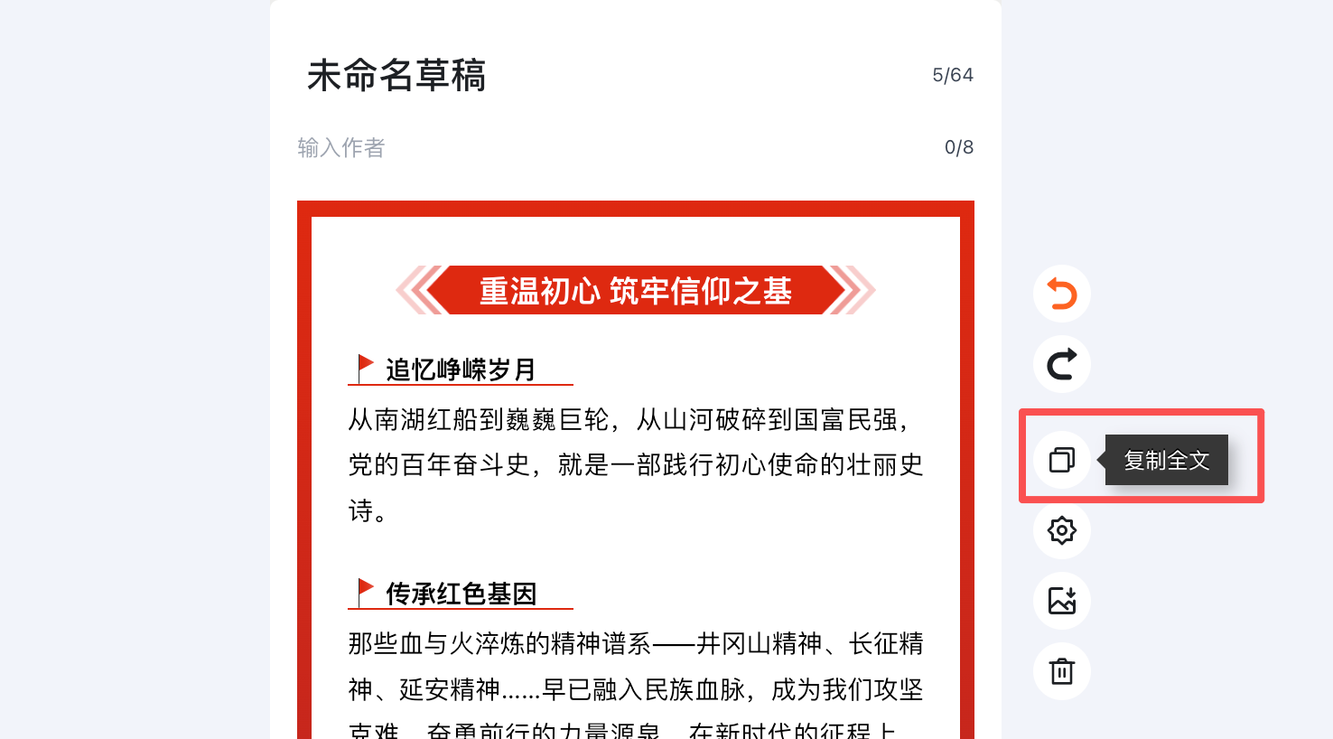 除微信同步外,对于不方便授权的用户,我们提供【复制全文】功能;用户排版完成后,只需要点击编辑区右侧的【复制全文】即可一键复制文章的所有内容到剪切板