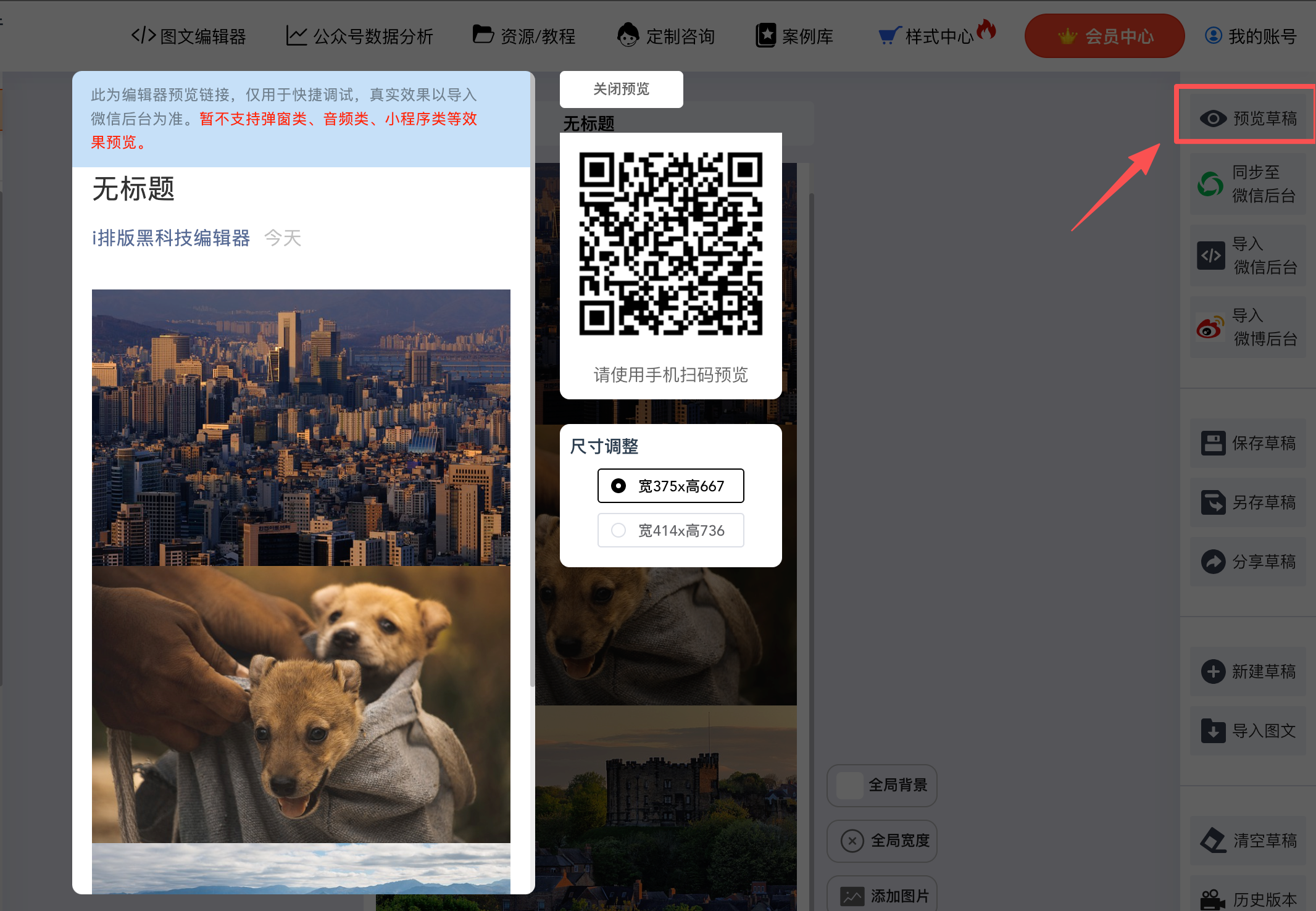 点击编辑器右侧的【预览草稿】按钮即可打开预览弹窗