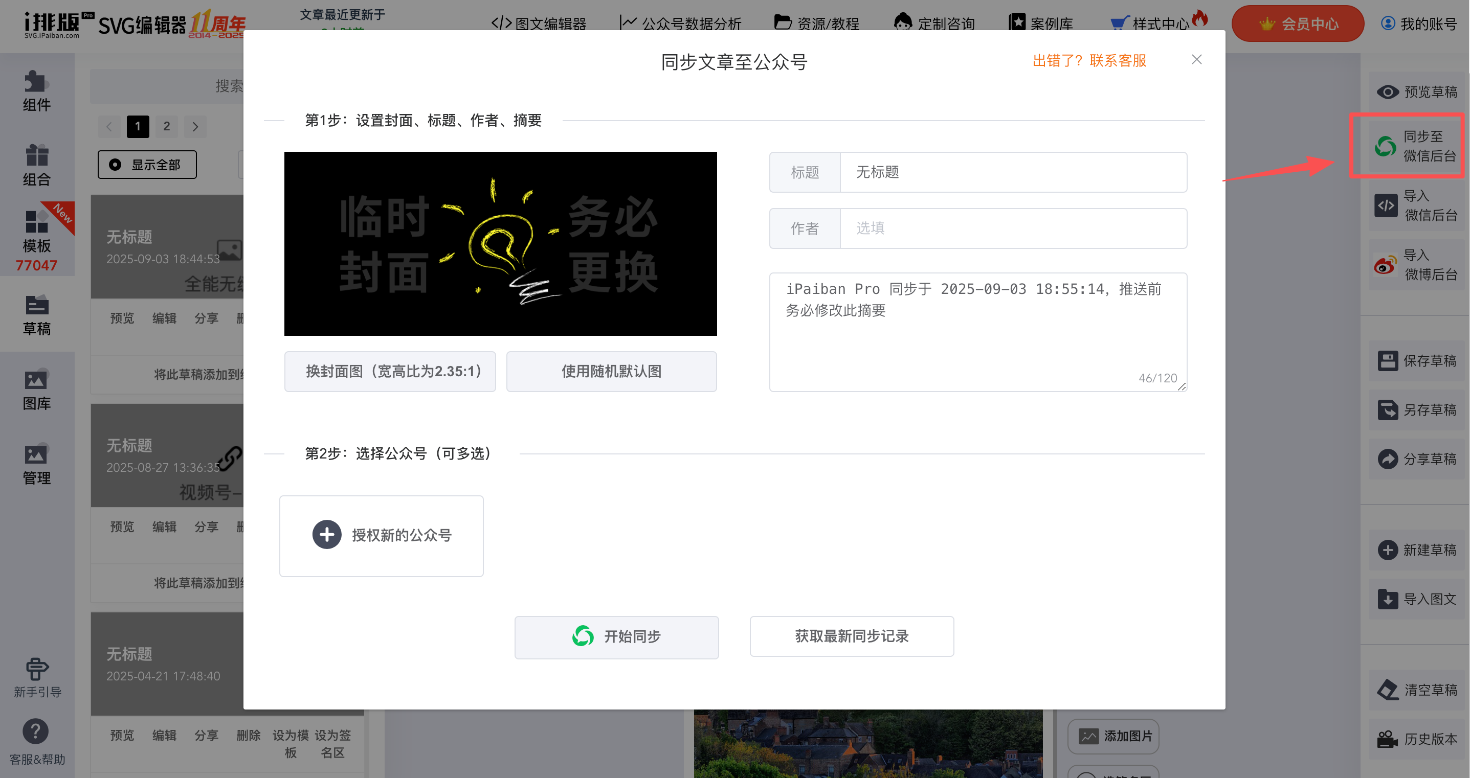 打开同步窗口后选择同步的公众号(可多选),然后点击【开始同步】,等待同步完成后即可看到预览二维码,扫描二维码即可实现微信环境的文章预览;