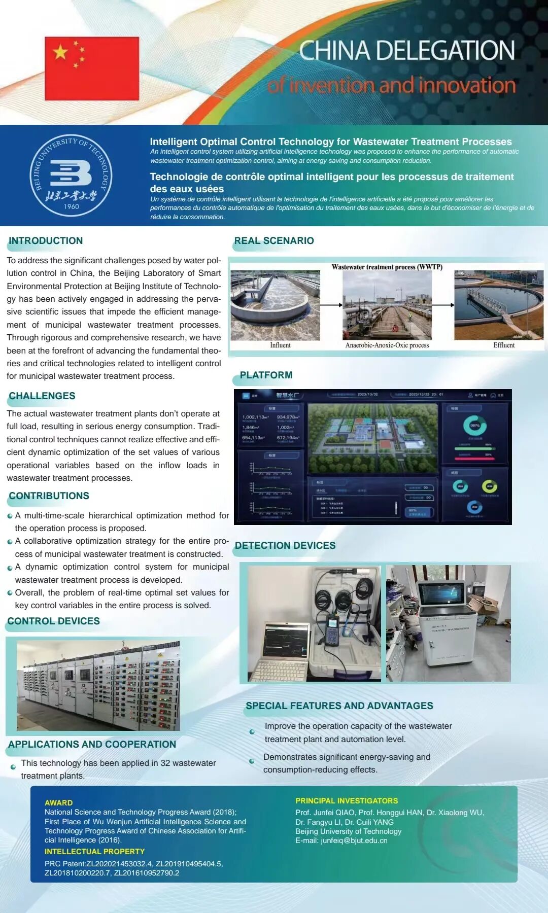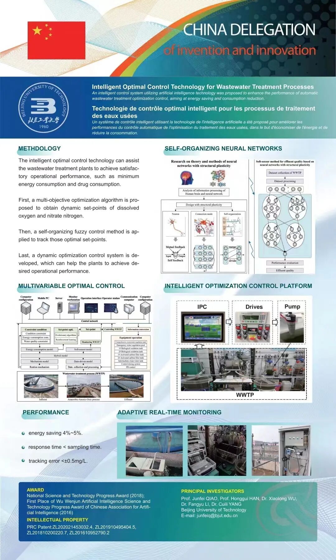 经过近20年的探索研究,我们建立了给予出水水质的城市污水处理过程多目标智能优化控制方法,解决了暴气量回流比的优化设定问题,研发出具有自主知识产权的城市污水处理智能优化控制系统,降低了吨水处理的能耗,实现了污水处理厂稳定达标排放和低成本运行。我们的技术已经在不同地区不同工艺30多家污水处理厂进行了成功的应用,并且取得了明显的经济效益和社会效益。2018年,我们的成果获得了国家科技进步二等奖。