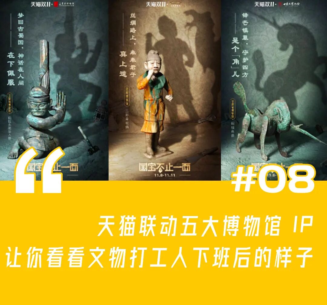 双11期间,天猫联合河南、甘肃、苏州、洛阳、三星堆五大博物馆,打造出了首个双 11 文化营销事件,并为此推出一支短片,通过博物馆「文物打工人」下班这一创意,让文物活灵活现、生动起来,同时结合当下网络流行热梗,让观众在趣味中拉近与传统文化之间的距离,唤醒内心深处的文化认同感。