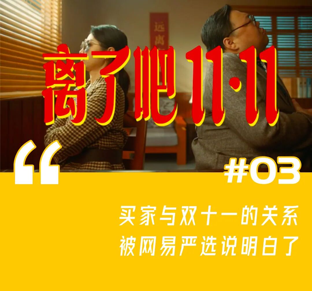 网易严选又把反套路营销玩出了新花样,今年双十一用一部离婚大戏,将买家与双十一之间的关系比喻为一对想要离婚的夫妻,通过妻子控诉丈夫越来越油腻的桥段,生动而真实地表达出了广大买家对于双十一活动套路多多的不满情绪,引起了不少观众的共鸣。戏剧感十足的同时,也以简单直接的方式表达出网易严选“一件即低价”的诚意,清新脱俗深入人心。