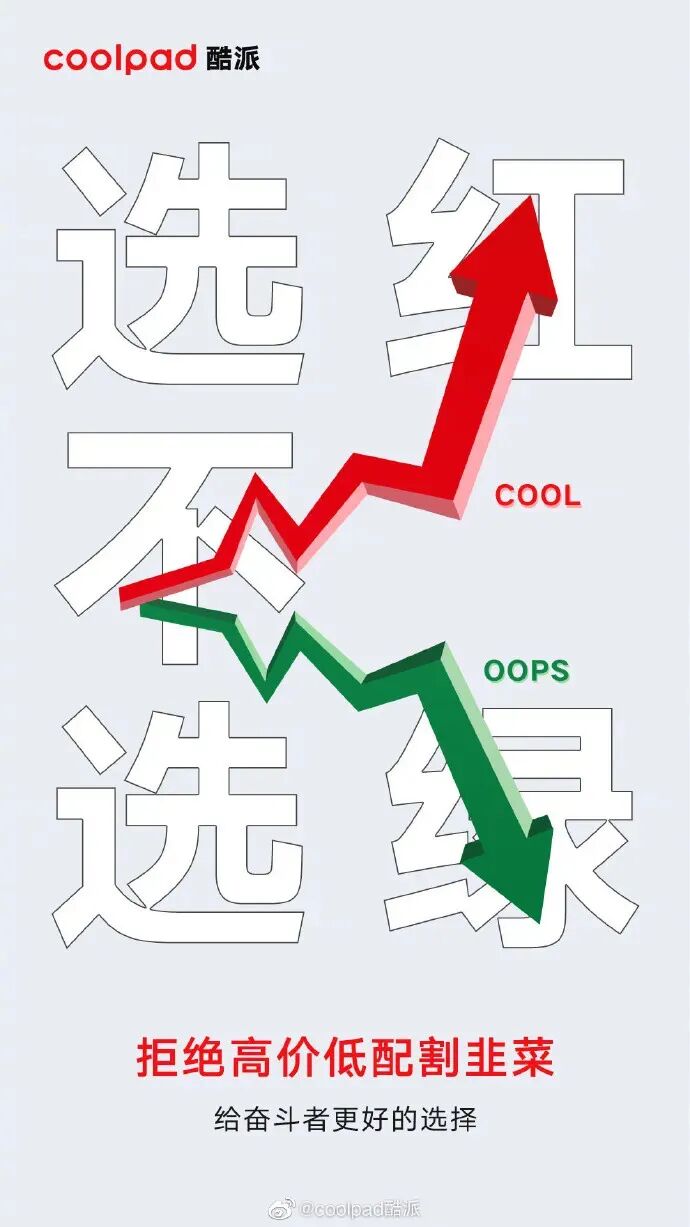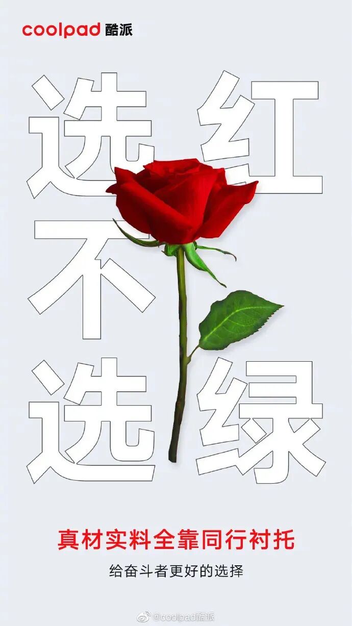 作为曾经手机品牌大佬之一的酷派,最近发布了一组“选红不选绿”的海报。由于海报中以绿色反衬红色、文案内涵味十足,让网友怀疑酷派在碰瓷同行OPPO,因此引起了不少网友的关注和讨论。作为已经淡出大众视野的品牌,想要重新复出势必艰难,但相比于碰瓷搞噱头,阿广觉得倒不如用产品实力说话来得实在,大家怎么看呢?