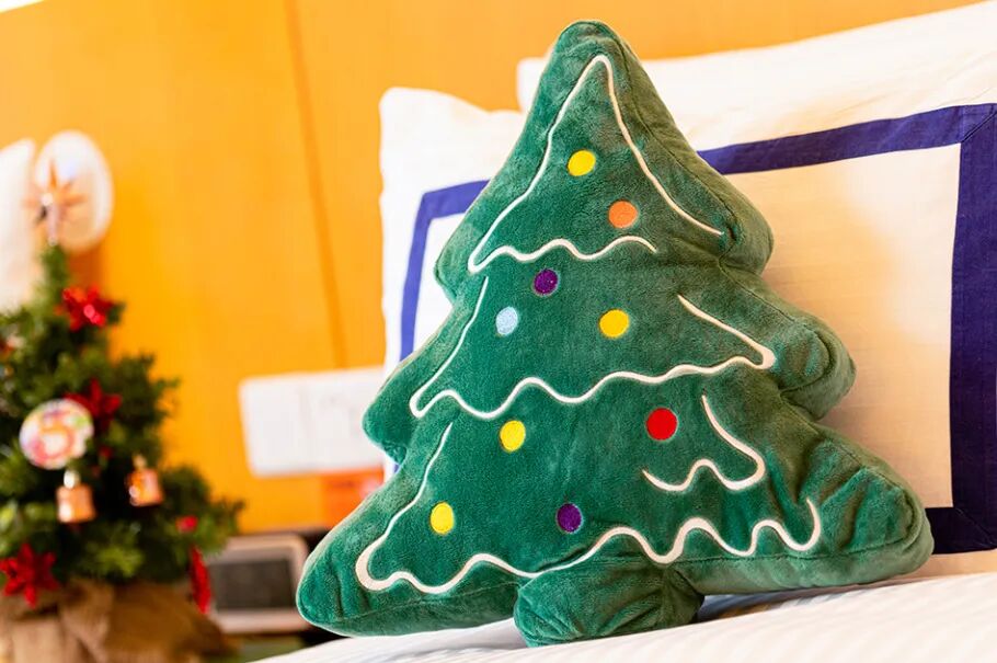 房间的圣诞树抱枕、拖鞋、明信片等纪念品,