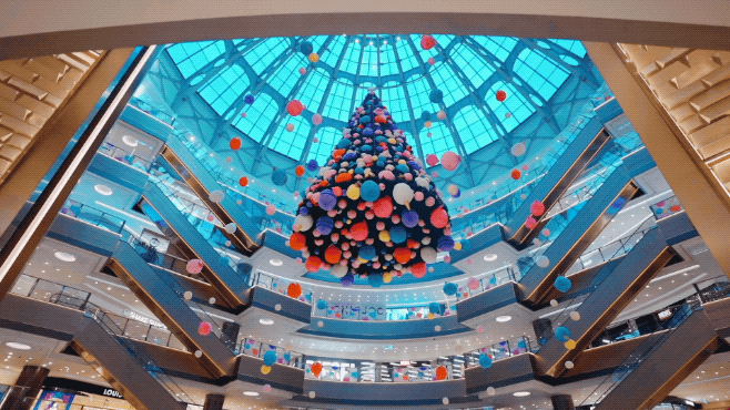 想必你已被这棵巨型圣诞树刷屏已久!点缀着7个皮克斯动画毛绒形象的它高达10米,实物相当震撼~