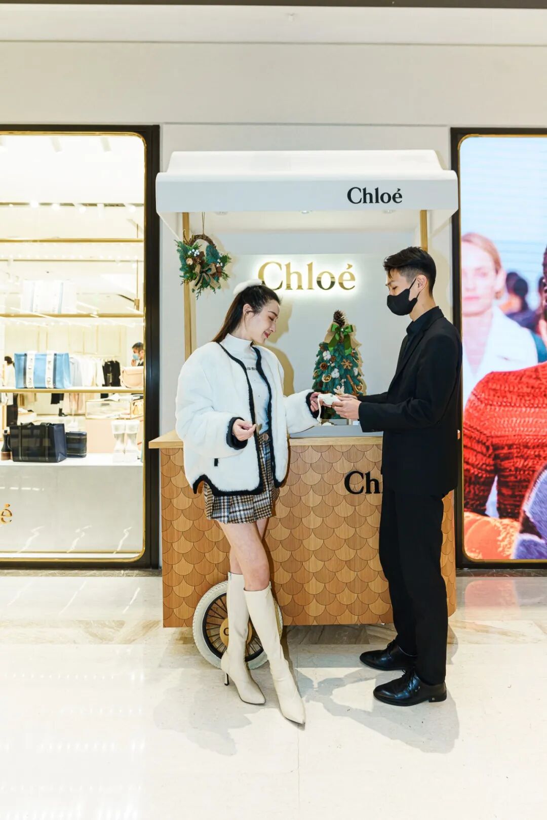 Chloe在一楼店铺门口也放置了一辆圣诞特别小餐车,帅气的店员会帮忙试香,现场还会赠送品牌限量福袋!