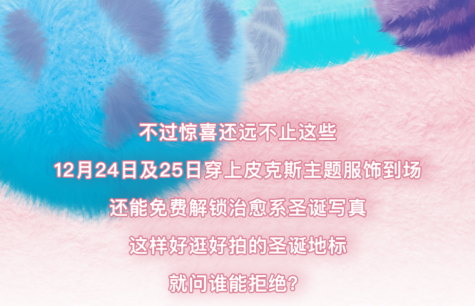 平安夜及圣诞节来这里,治愈氛围加倍!当天(12月24日及12月25日)11:00-20:00穿着毛绒绒服饰或着迪士尼主题角色服装,还能现场拥有专业摄影师拍摄的绝美写真~