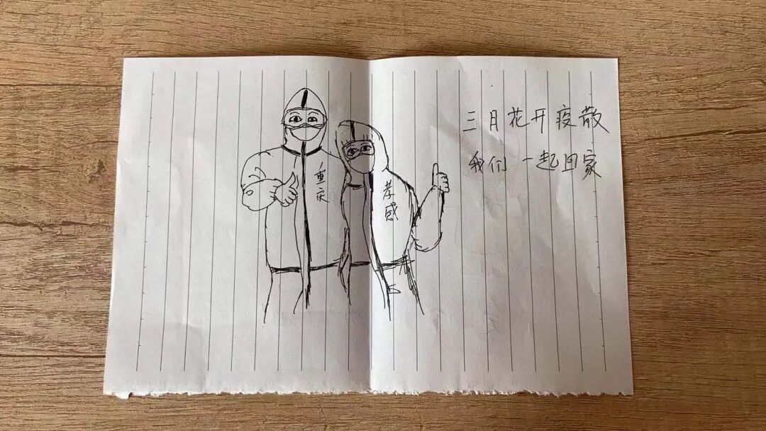 重庆两江新区第一人民医院的护士焦祖惠,逆行出征湖北,与孝感护士黄倩在一起抗击疫情三十多天,建立了深厚的友谊。临回重庆时,黄护士赠送给她自己画的一张画,相约“三月花开疫散,我们一起回家”。在送行现场,一位陌生大叔又送焦祖惠一首诗,因为都戴着口罩,仨人都不清楚对方究竟长啥样。今年春节他们仨通过视频连线,诗情画意“云团聚”。