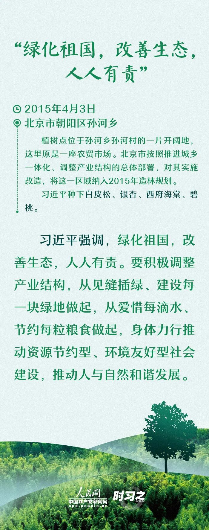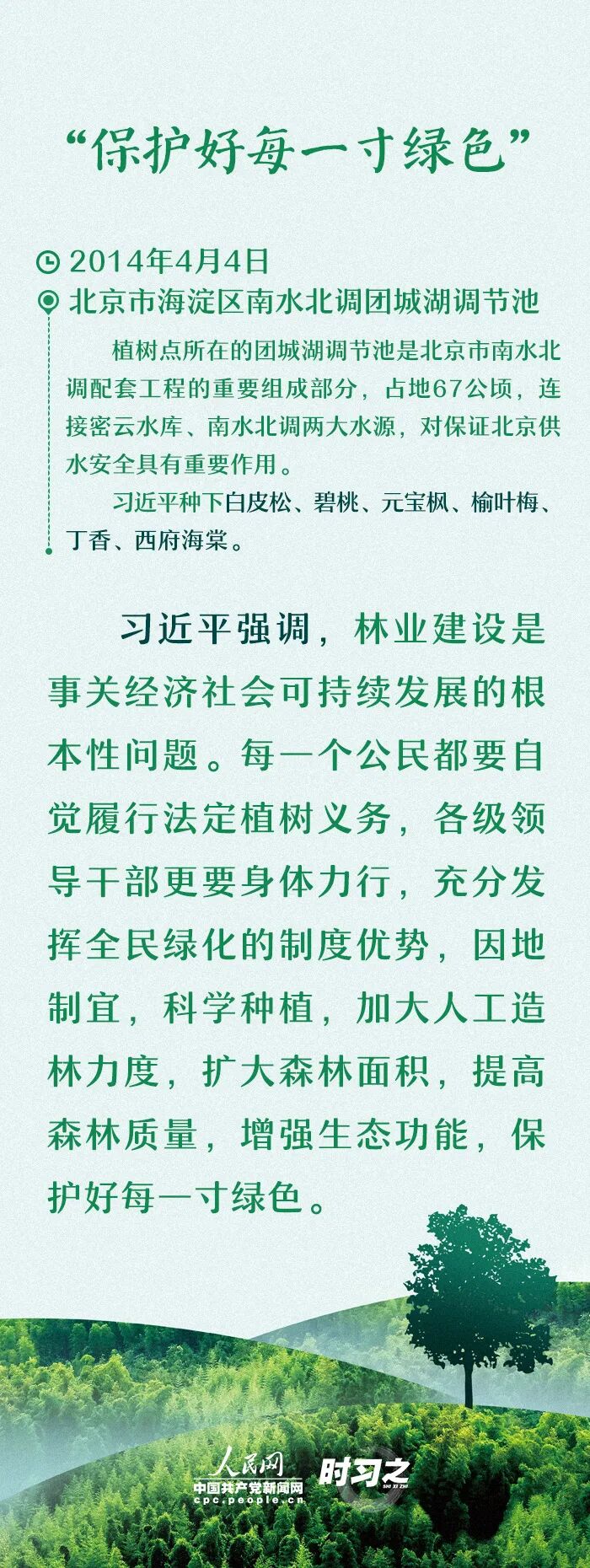 春风吐绿、草木初萌,又是一年植树节。“造林绿化是功在当代、利在千秋的事业” “前人栽树,后人乘凉”……党的十八大以来,习近平总书记每年都会参加义务植树活动,并多次谈到植树造林的重大意义。过去九年间,习近平总书记都在哪里植树?种了哪些树?每次植树都讲了些什么,一起来回顾。