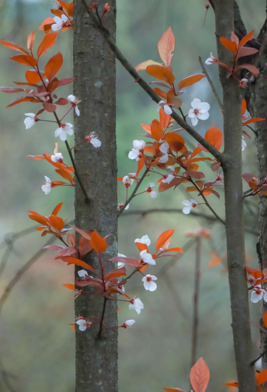 紫叶李,别名:红叶李,蔷薇科李属落叶小乔木,叶常年紫红色在绿叶丛中,像一株株永不败的花朵,在青山绿水中形成一道靓丽的风景线。