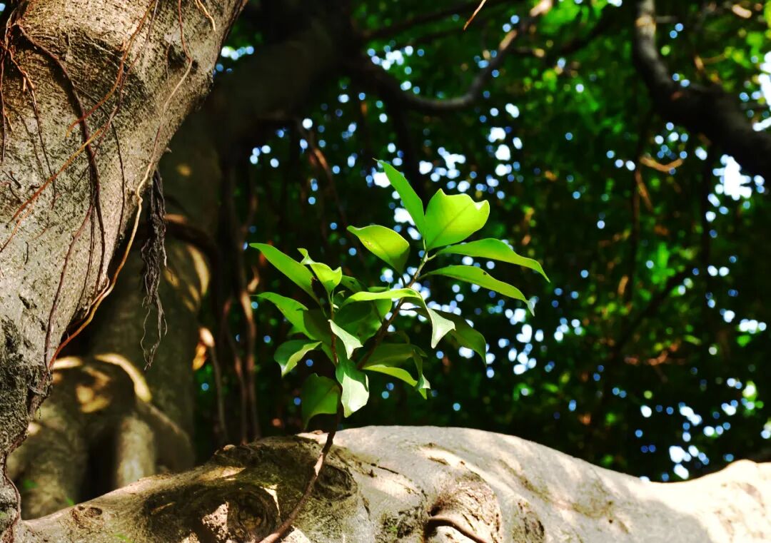 黄葛树,别名黄桷树、大叶榕树、马尾榕、雀树。它在佛经里被称为神圣的菩提树。黄葛树属高大落叶乔木。茎干粗壮,树形奇特,悬根露爪。树叶茂密,叶片油绿光亮。