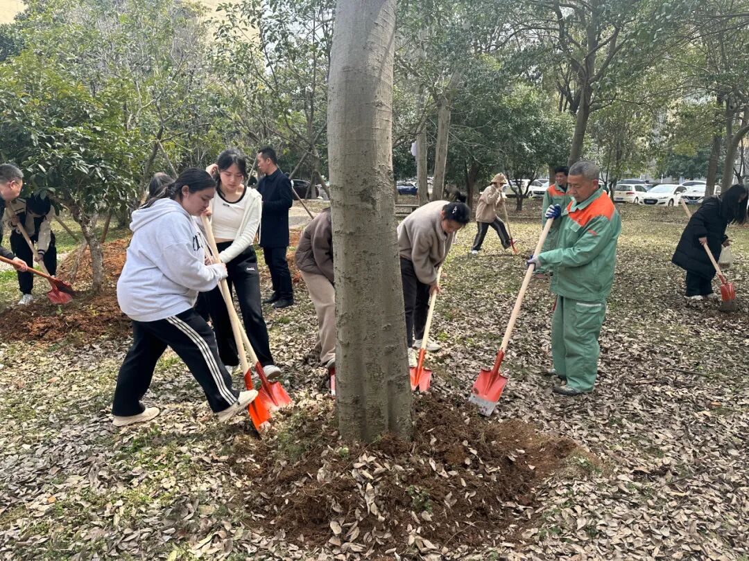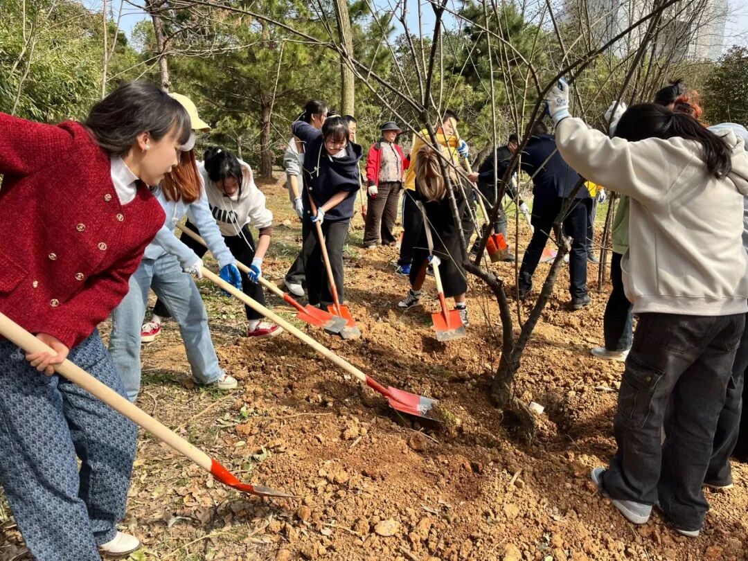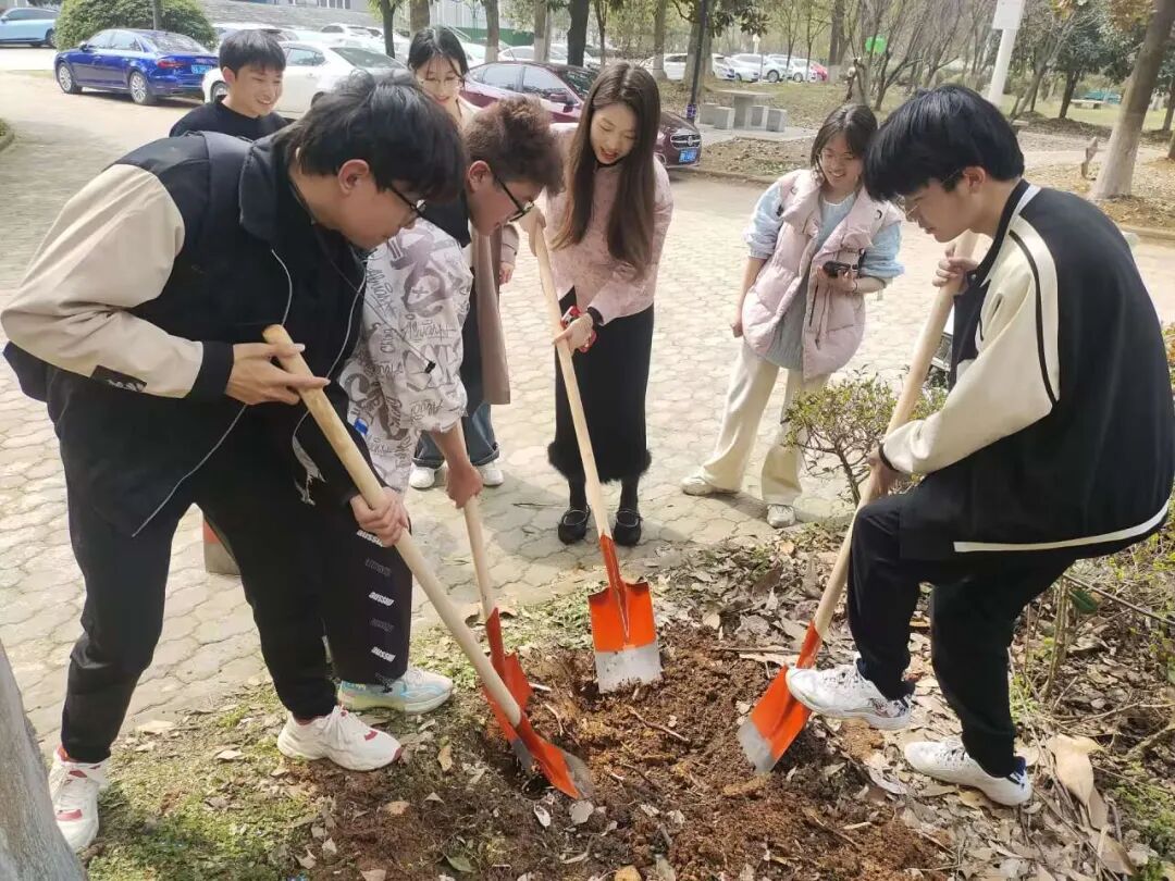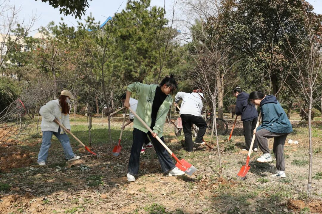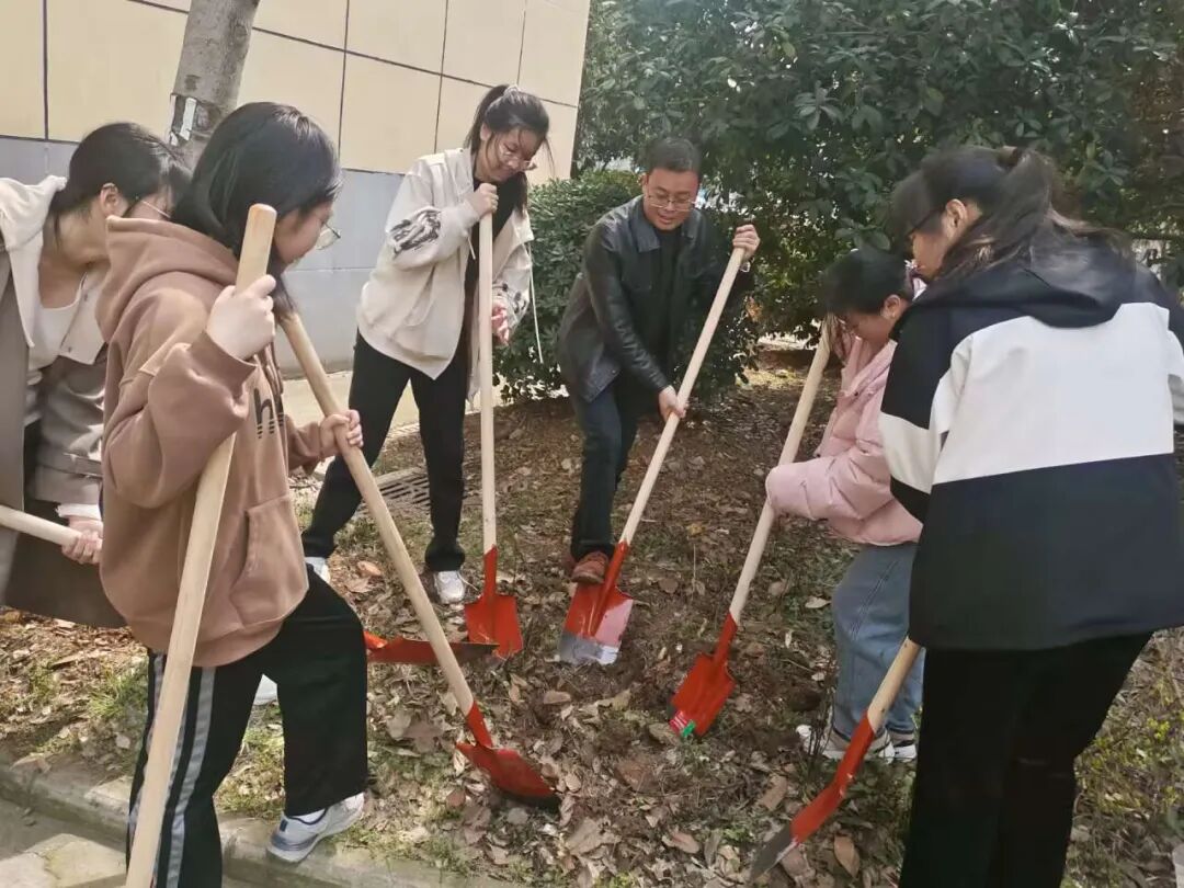 教育学院师生也在J04教学楼A区绿化片区,举办了“‘植’此青绿,拥抱春天”劳动教育实践活动。大家拿起铁锹、水壶走进植树点,在后勤老师们的指导下,分组协作,挖坑、种树、松土、浇水,共同为校园添绿增彩。