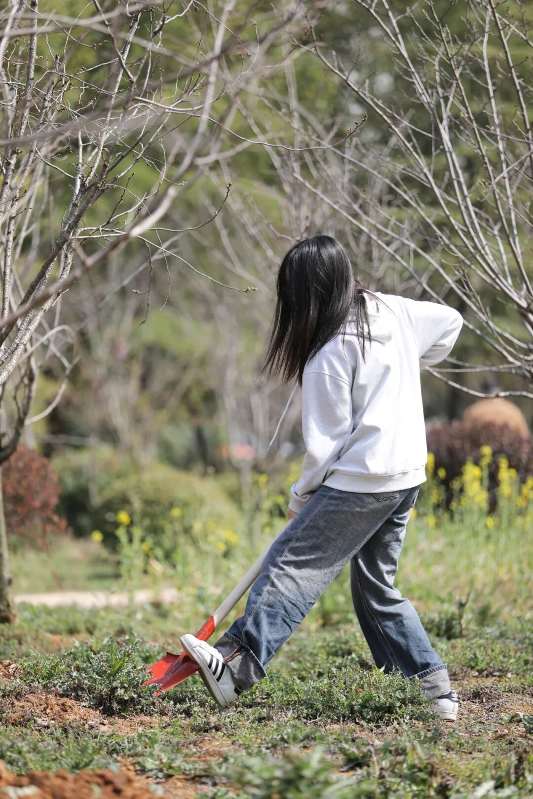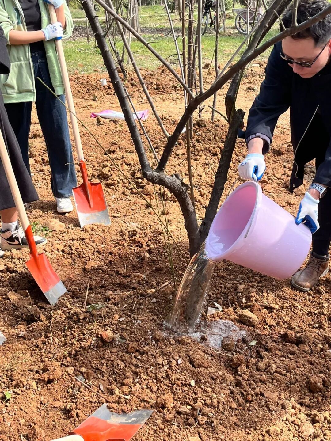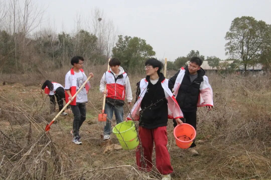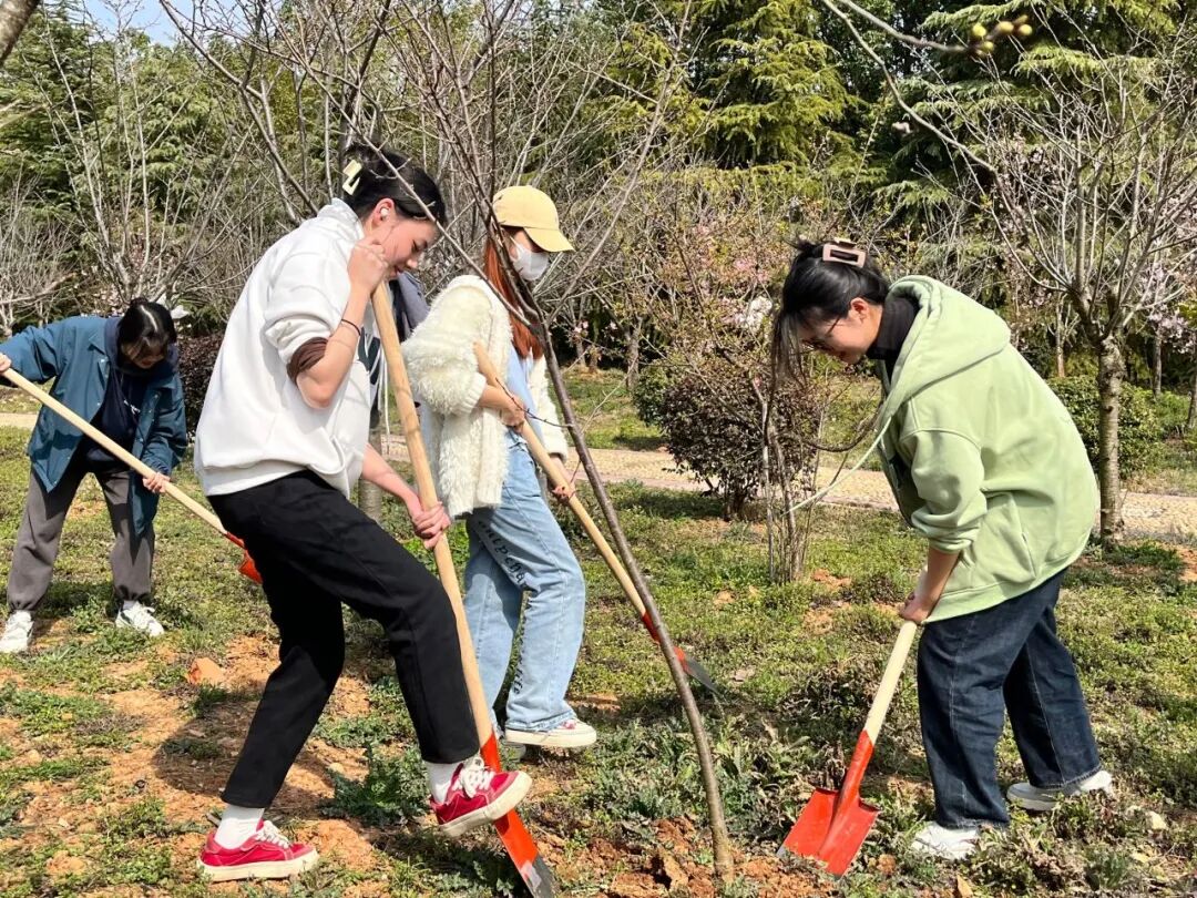 教育学院师生也在J04教学楼A区绿化片区,举办了“‘植’此青绿,拥抱春天”劳动教育实践活动。大家拿起铁锹、水壶走进植树点,在后勤老师们的指导下,分组协作,挖坑、种树、松土、浇水,共同为校园添绿增彩。