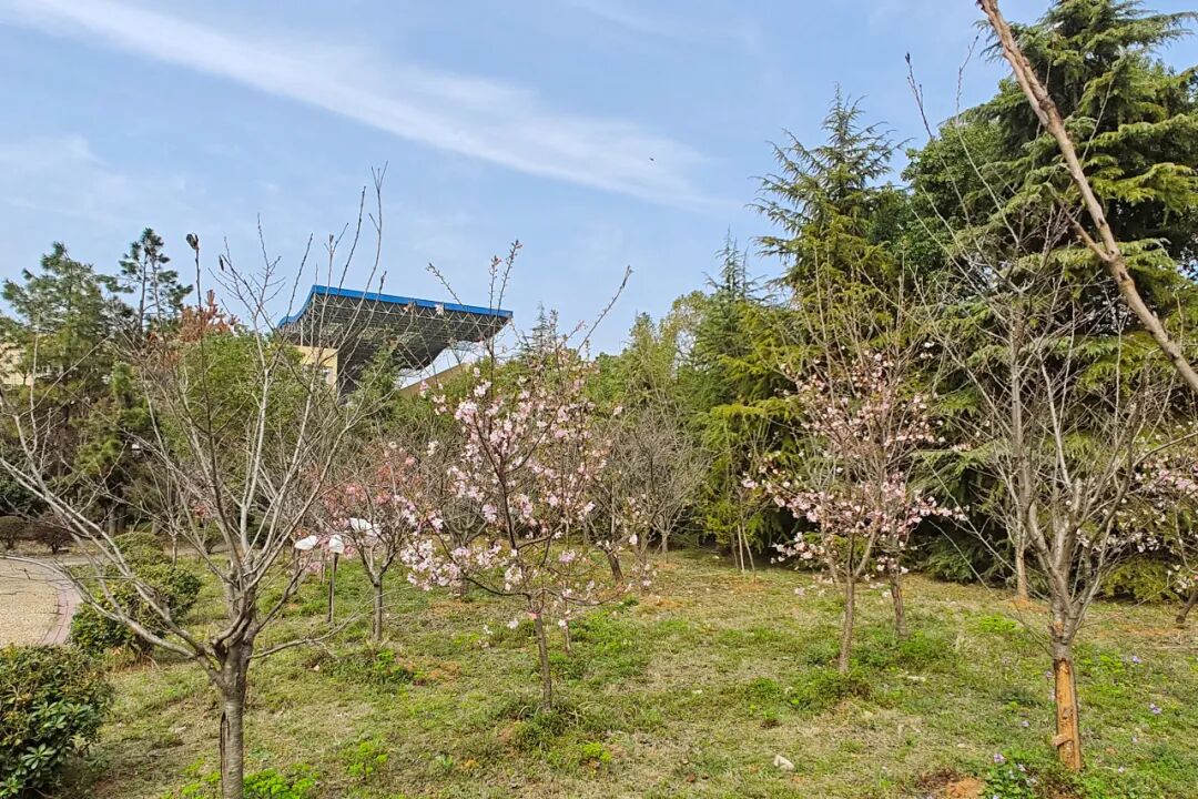 新栽植的小梅花树与小樱花树迎风而立,生机盎然,为美丽江大再添新绿!