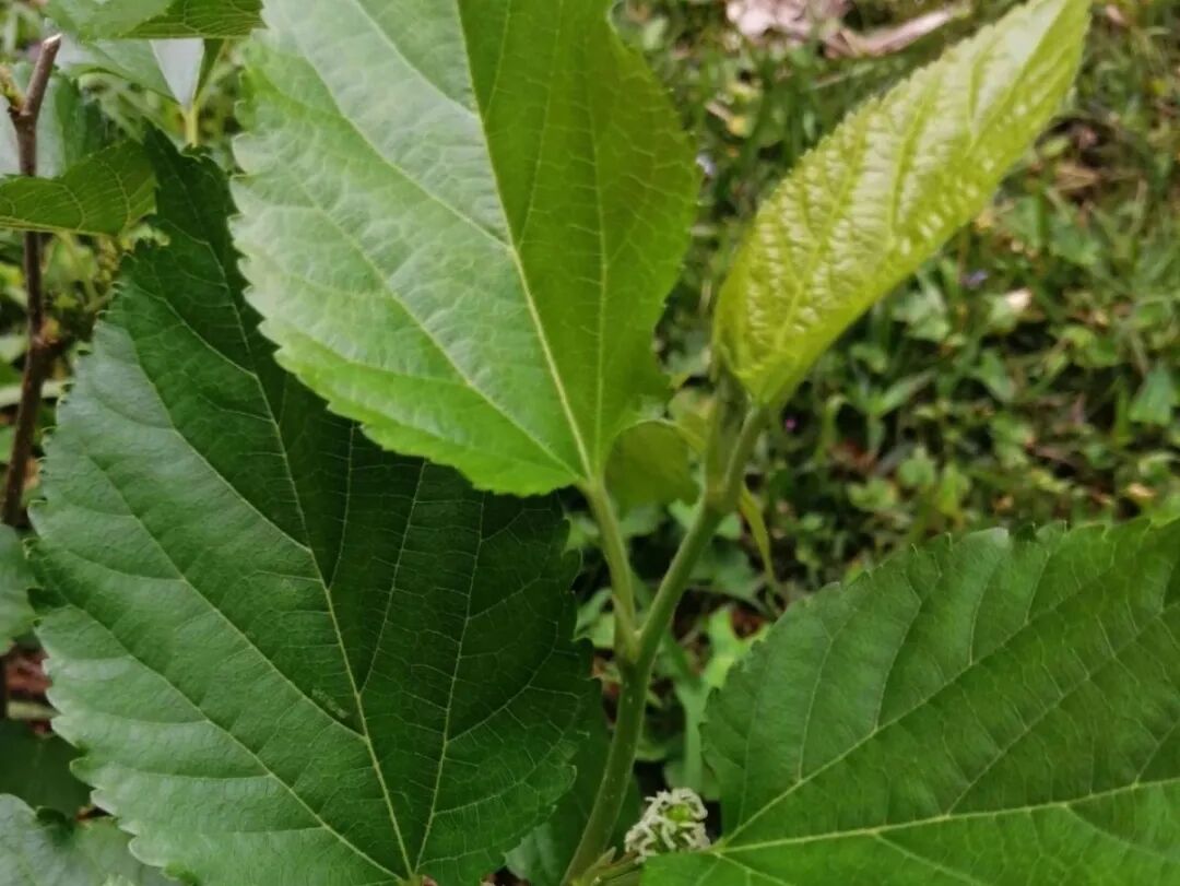 桑,桑科、桑属落叶乔木或灌木植物,树干较高。桑的叶为卵形或宽卵形,长5-15厘米,先端尖或渐短尖,基部圆或微心形,锯齿粗钝,有时缺裂,上面无毛,下面脉腋具簇生毛;叶柄长1.5-5.5厘米,被柔毛。