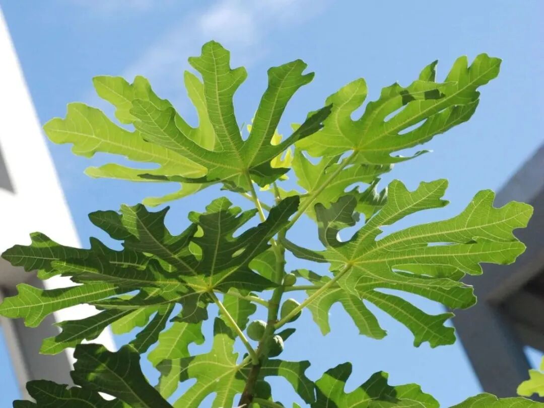 无花果,桑科、榕属落叶灌木,株高达10米,多分枝;小叶粗,叶互生,厚纸质,宽卵圆形,长宽10-20厘米,掌状3-5裂,小裂片卵形,具不规则钝齿,上面粗糙,下面密被钟乳体及灰色柔毛,基部浅心形;叶柄粗,长2-5厘米,托叶卵状披针形。