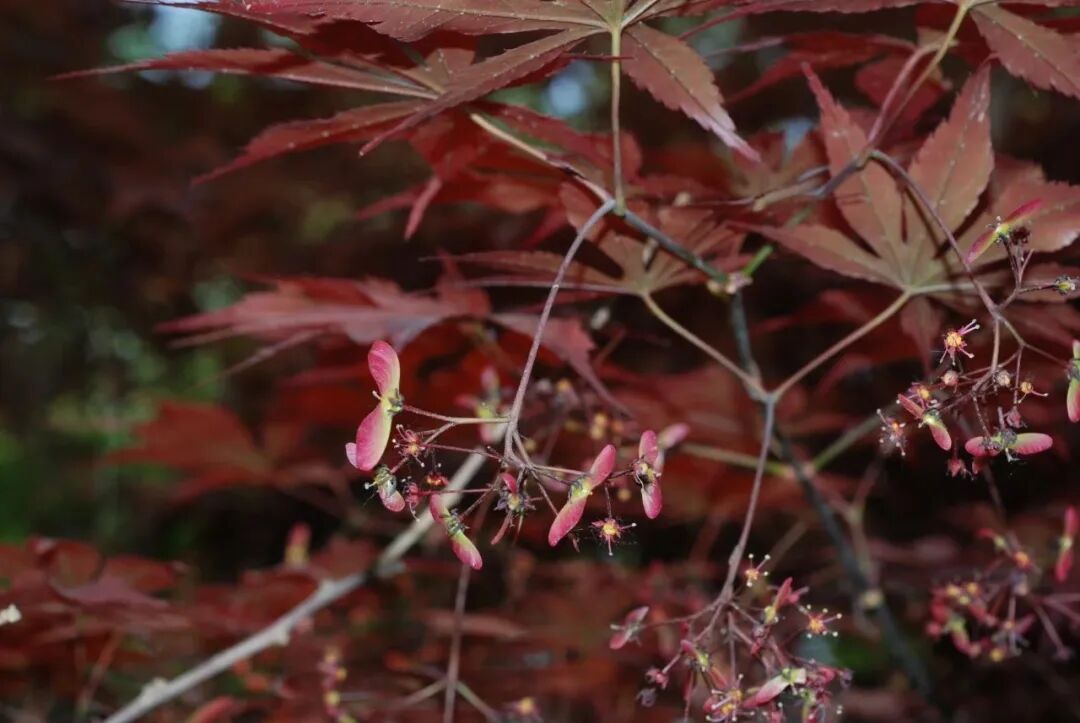 红枫,无患子科、槭属落叶小乔木,树冠伞形,枝条开张,细弱。单叶对生,近圆形,薄纸质,掌状7-9深裂,裂深常为全叶片的1/2-1/3,基部心形,裂片卵状长椭圆形至披针形,先端尖,有细锐重锯齿,背面脉腋有白簇毛。伞房花序径约6-8 mm,萼片暗红色,花瓣紫色。果长1-2.5 cm,两翅开展成钝角。花期5月;果期9-10月。叶片常年红色或紫红色,枝条紫红色。