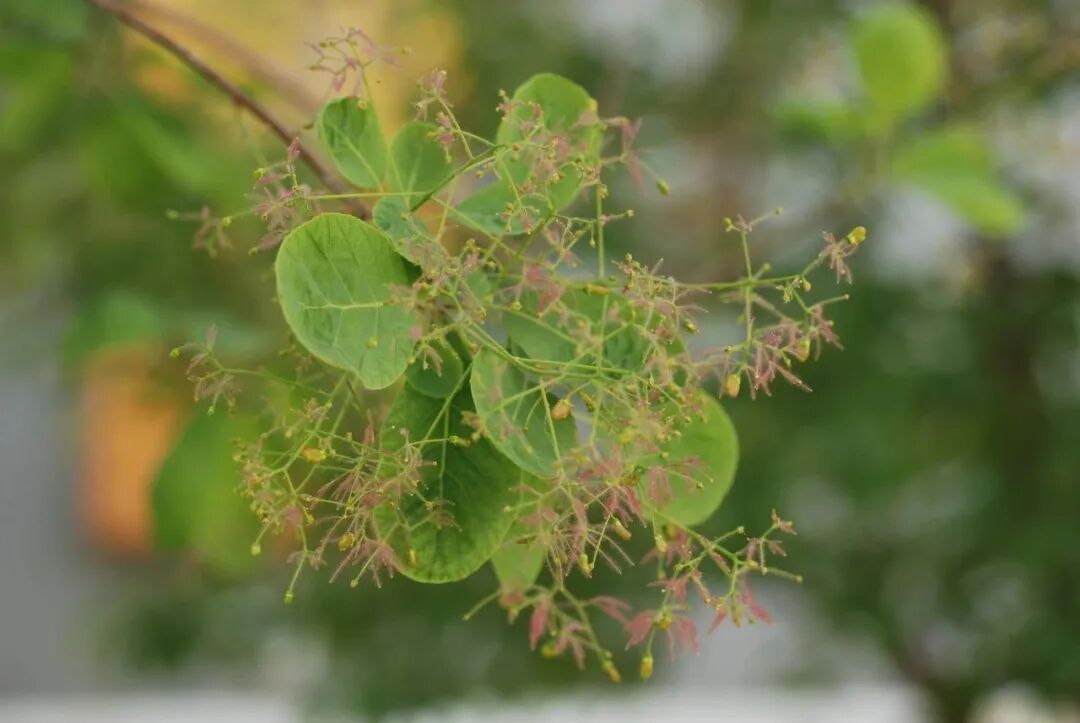 黄栌,漆树科、黄栌属落叶灌木植物。黄栌的叶倒卵形或卵圆形,长3-8厘米,宽2.5-6厘米,先端圆形或微凹,基部圆形或阔楔形,全缘,两面或尤其叶背显著被灰色柔毛,侧脉6-11对,先端常叉开;叶柄短。