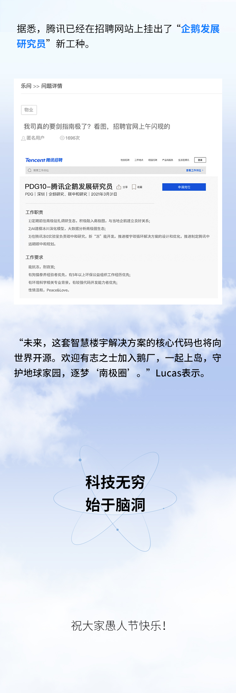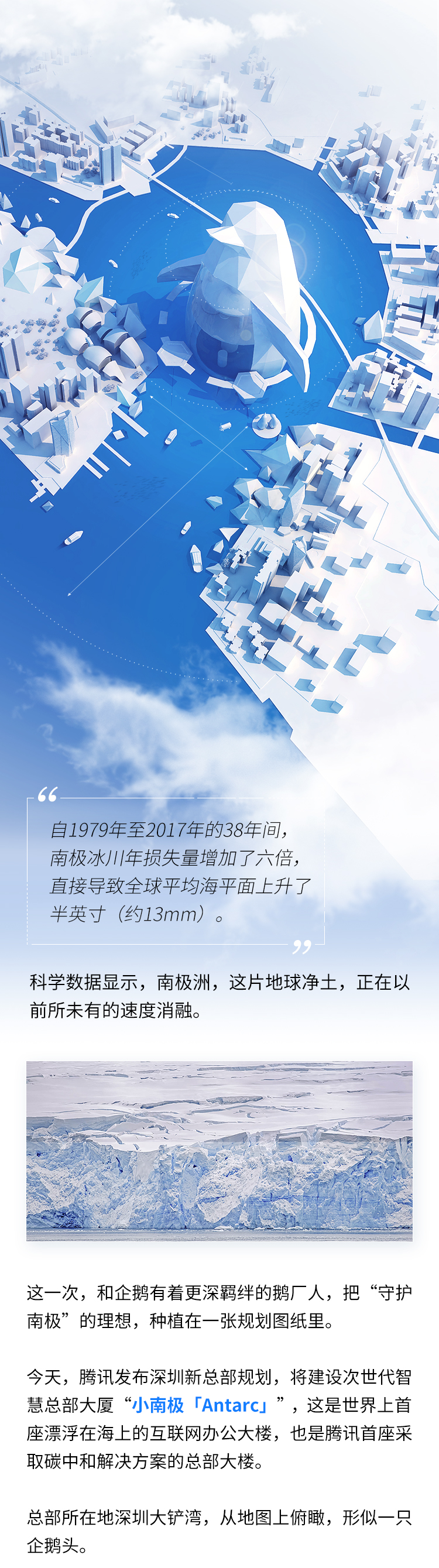 推荐:腾讯总部在愚人节这一天假装推出“南极洲腾讯总部”建设计划,用“点击切换GIF+伸缩式展开”的交互形式,详细的说明了此次“小南极”互联网大楼的设计方案,以及“企鹅”不同部位计划打造的各种功能,假装真的准备实行计划,最后在结尾部分强调未来实现,借此送出愚人节祝福。