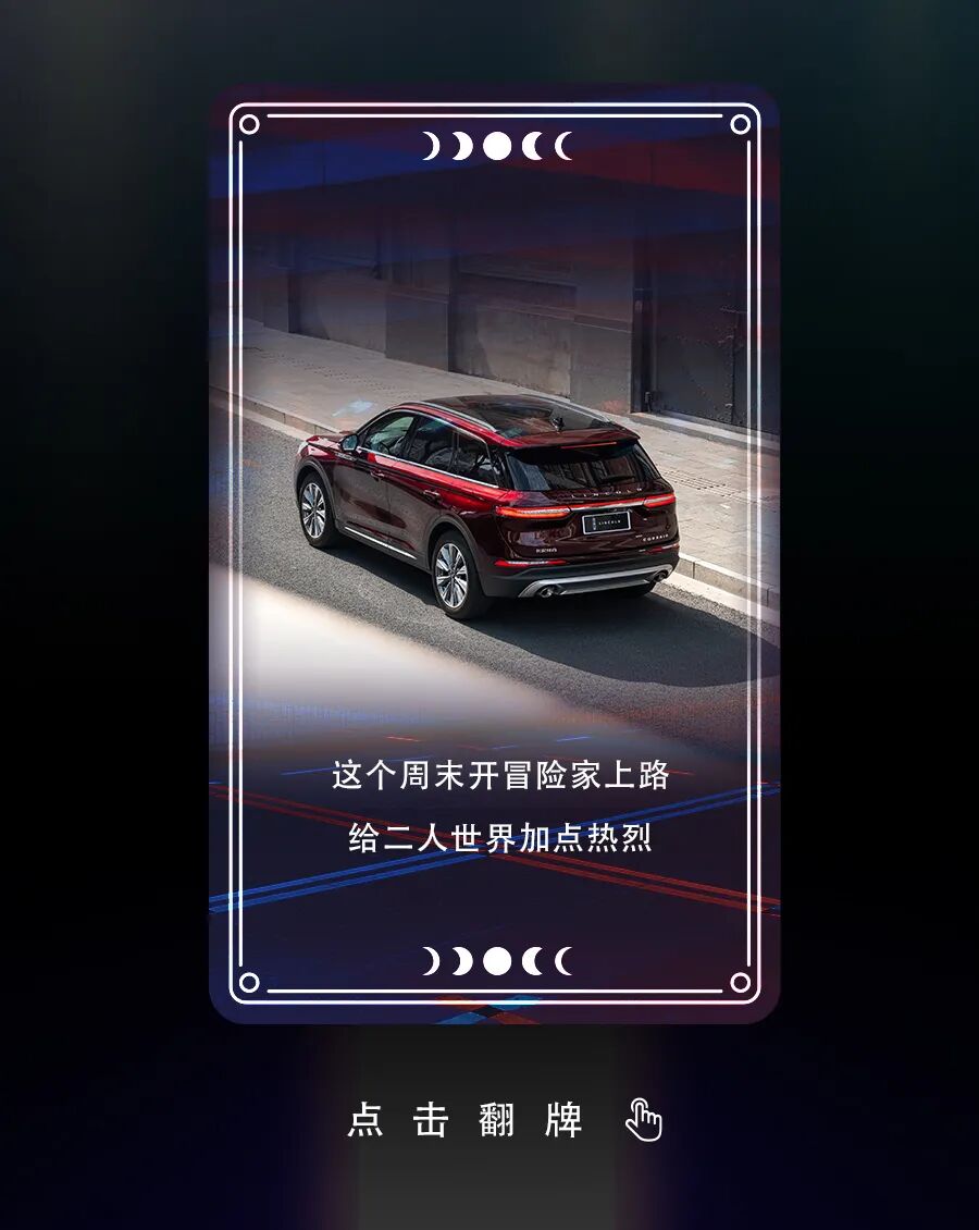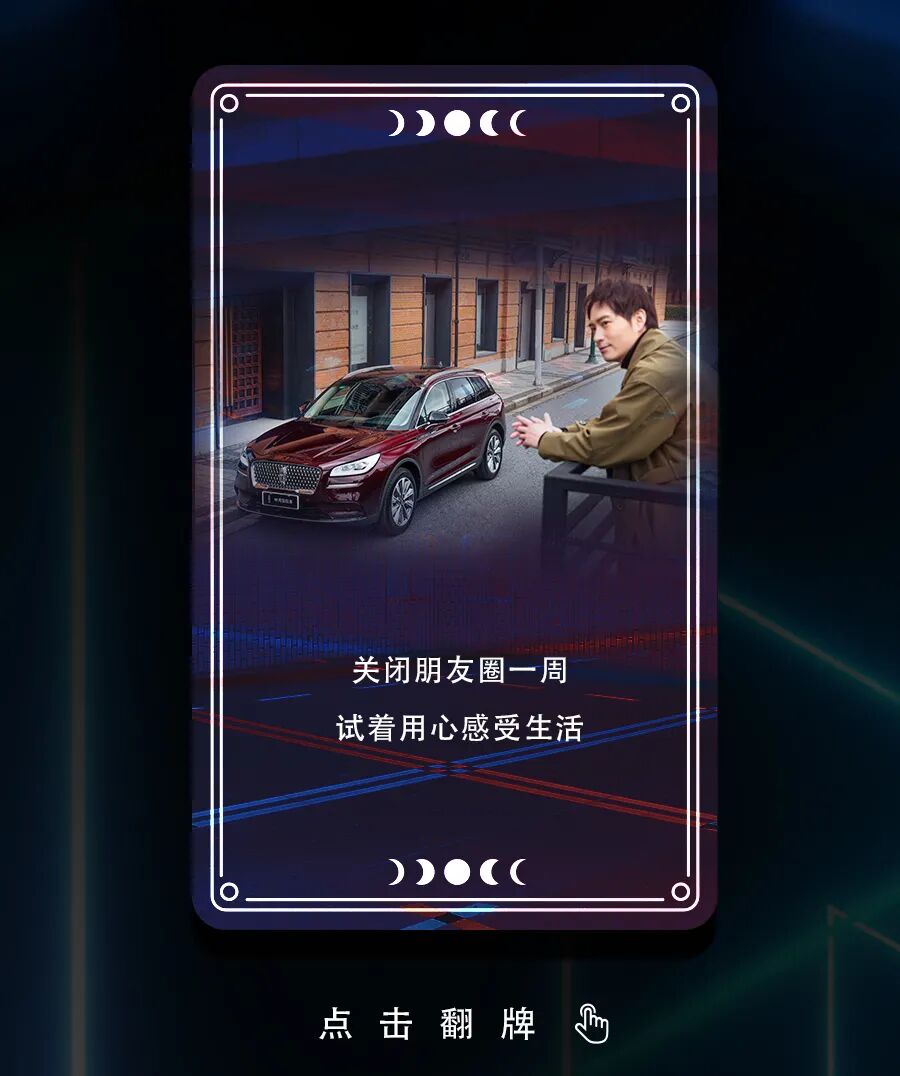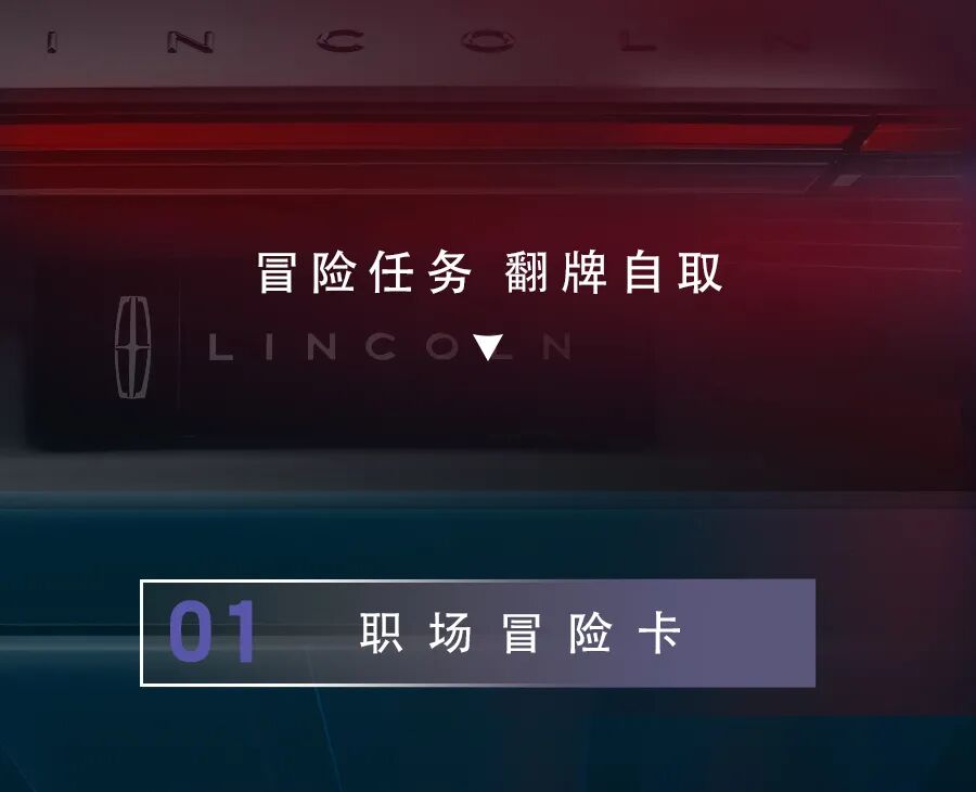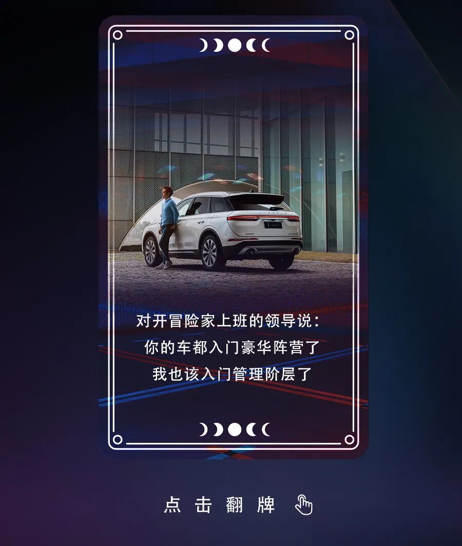 推荐:林肯汽车通过“点击切换图片”的交互形式,模拟职场冒险卡、社交冒险卡和情感冒险卡,吸引大家点击翻牌和互动。