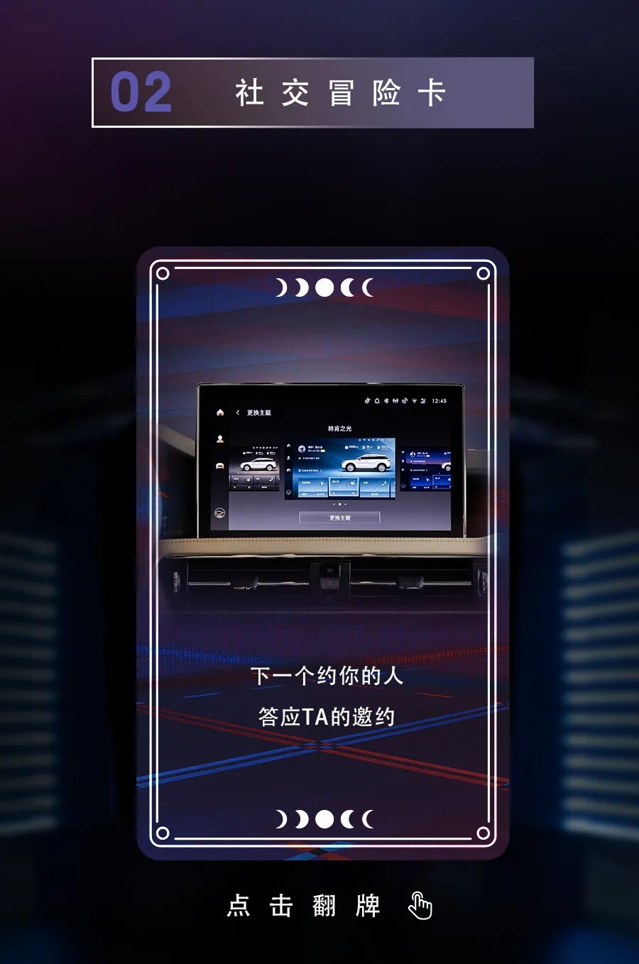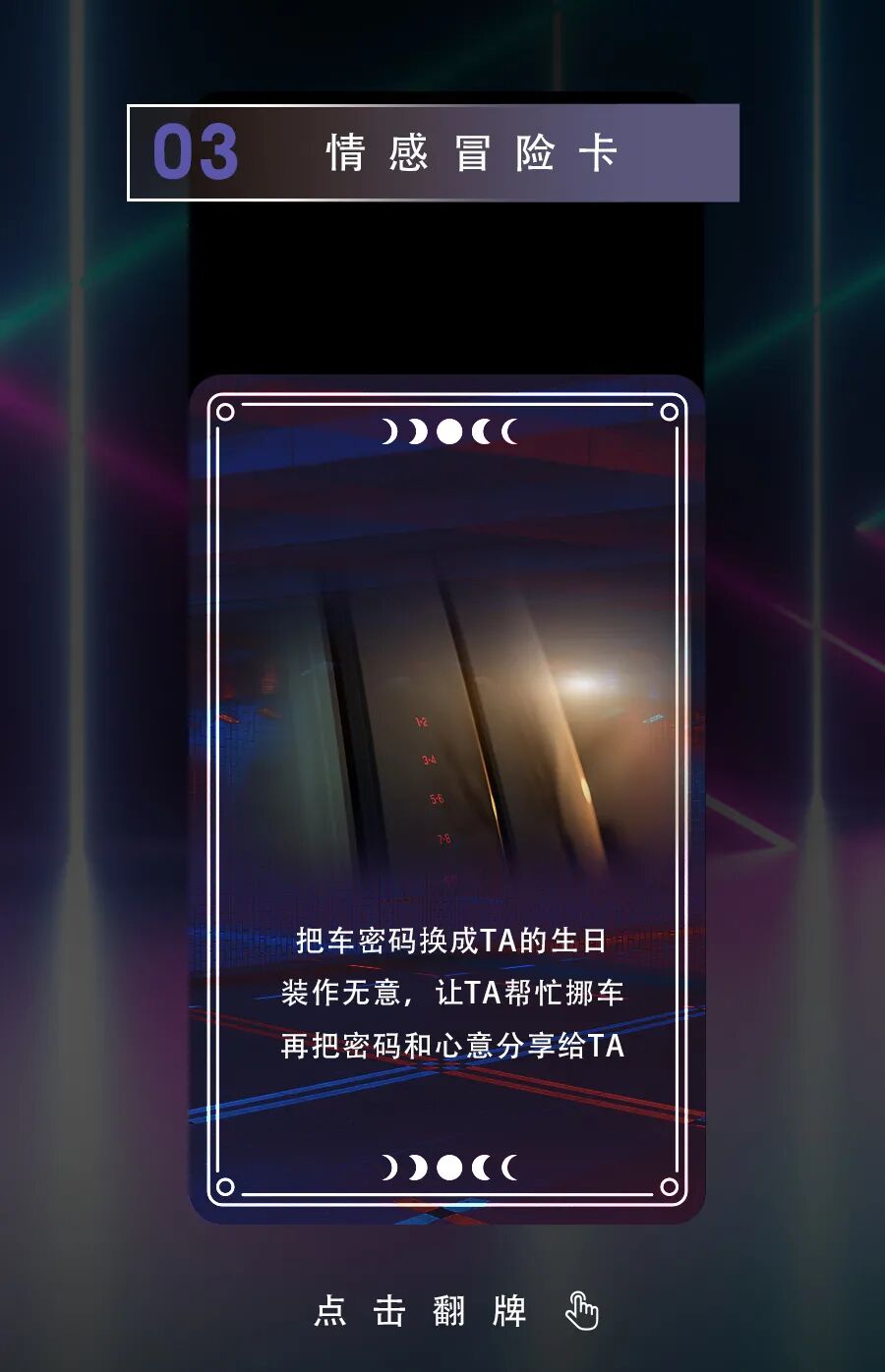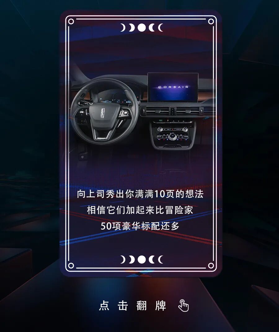 推荐:林肯汽车通过“点击切换图片”的交互形式,模拟职场冒险卡、社交冒险卡和情感冒险卡,吸引大家点击翻牌和互动。