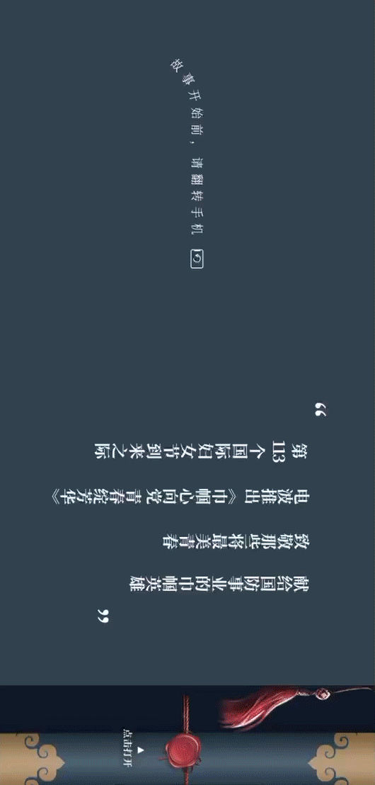 八一建军节,北京天使童声合唱团通过「点击向上移出切换图片+展开」的交互形式,带大家观看天使童声合唱团军歌合唱表演节目的视频,借此向可爱的中国军人致敬。