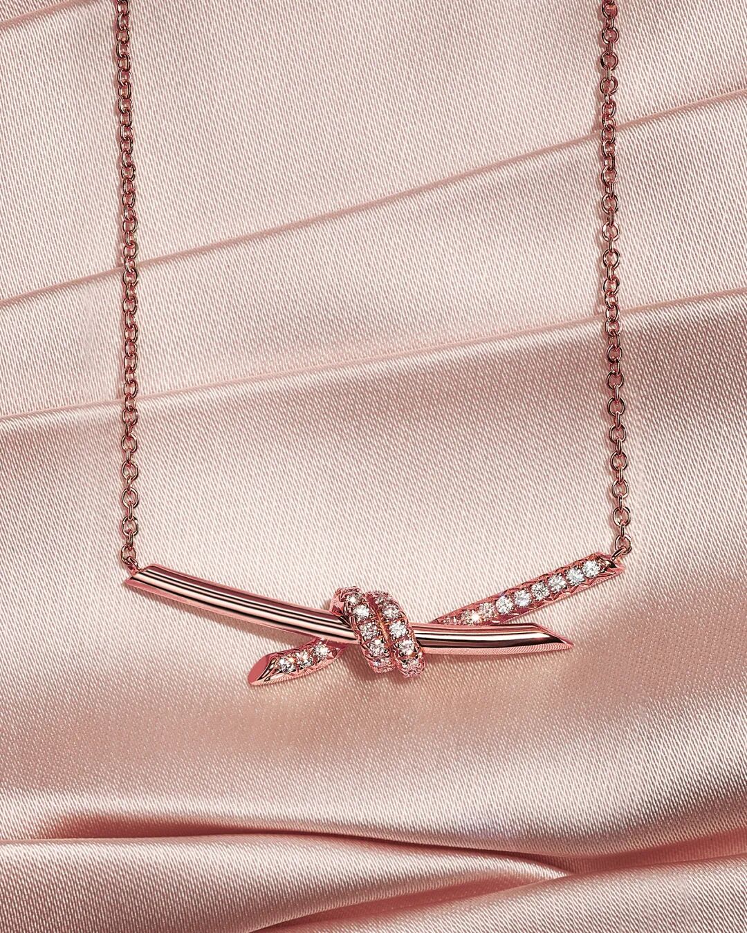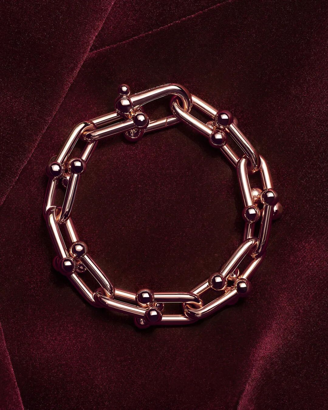 左:Tiffany & Co. 蒂芙尼Lock系列18K玫瑰金及白金镶钻手镯右:Tiffany & Co. 蒂芙尼Knot系列18K玫瑰金镶钻吊坠左:Tiffany & Co. 蒂芙尼HardWear系列18K玫瑰金链环手链