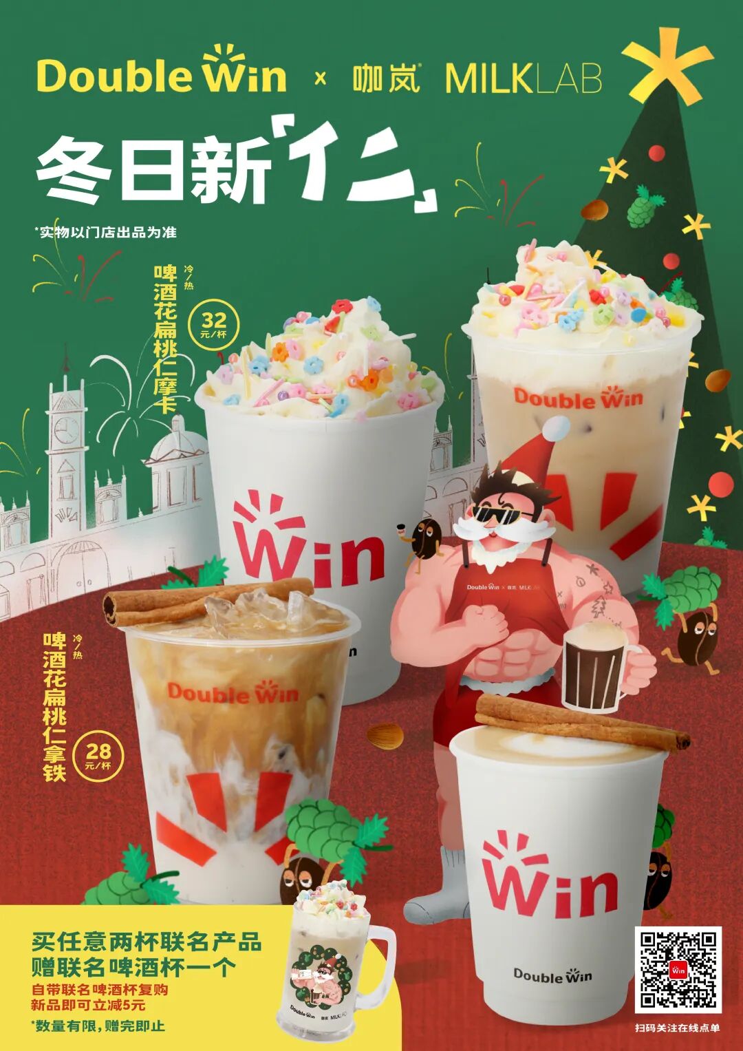 即日起–2023年1月10日, 澳大利亚国宝级植物奶牛奶品牌咖岚MILKLAB和创意新潮的Double Win coffee 梦幻联动,合作推出【冬日新“仁”】特别活动,Double Win全国门店同步上新咖岚MILKLAB扁桃仁奶出品的新品咖啡:啤酒花扁桃仁拿铁/啤酒花扁桃仁摩卡。冬日主题店同步上线“寻找幸运新Ren”活动,购买用到扁桃仁奶的无酒精健康饮品,即可帮冬日老人去除“啤酒肚”,撕下门店冬日老人立牌身上的便利贴写下心愿,帮大腹便便的冬日老人变身健康活力的冬日新“仁”, 咖岚MILKLAB & Double Win将抽取幸运儿实现便利贴上的愿望。