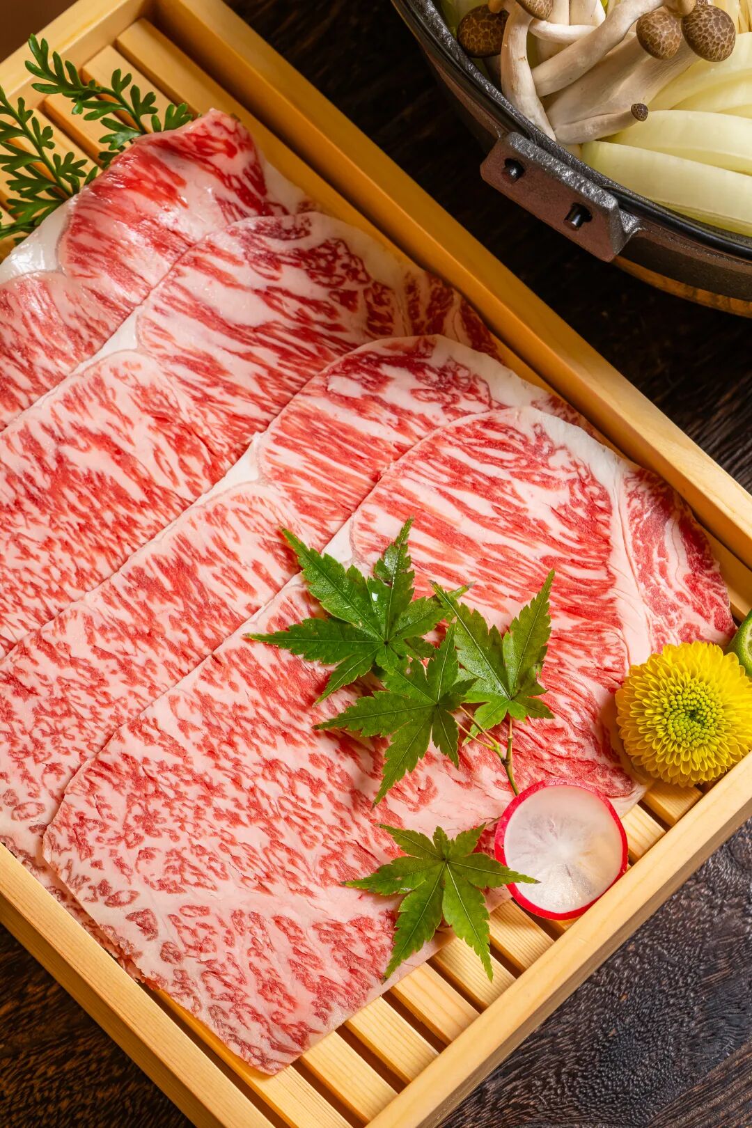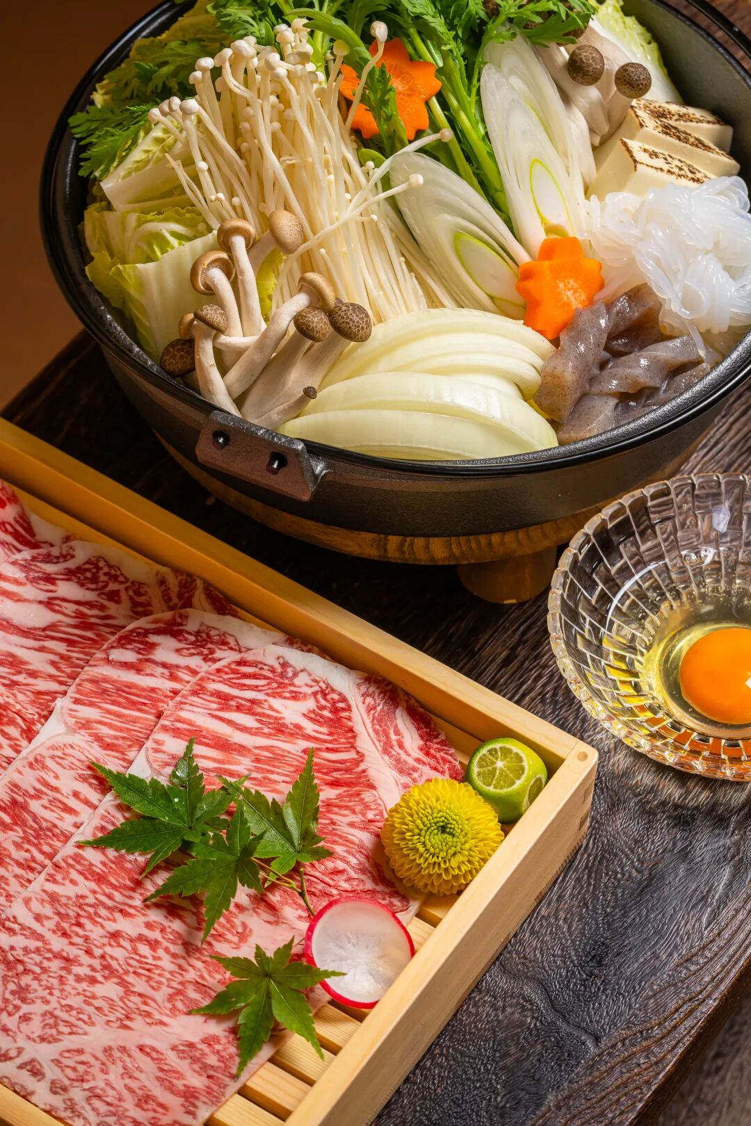 极上西冷寿喜烧精选和牛肉片,肉色鲜红,纹路均匀有光泽,肉细而紧密,煎熟后锅边淋入特制寿喜锅酱汁,随后根据个人喜好依次放入菜、豆腐,香菇,金针菇等蔬菜,香气四溢,配以特调的新鲜蛋液酱汁,入口柔嫩鲜香,每口都想直呼:过瘾!