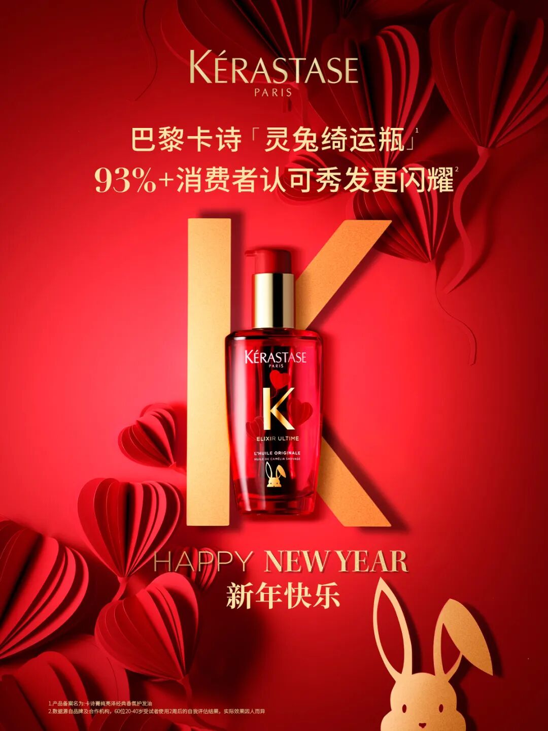 新岁将至,邂逅绮运。巴黎卡诗倾呈「灵兔绮运瓶」,许你2023璀璨红运,至臻山茶花精粹,轻盈不腻,一抹瞬间吸收,秀发亮泽闪耀。