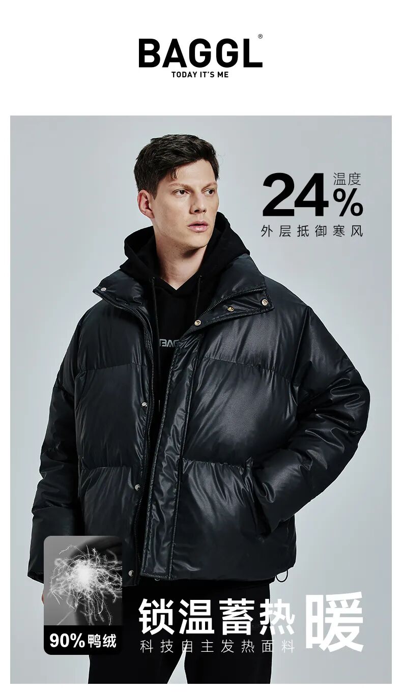 BAGGL秋冬系列羽绒服,采用时尚宽松的H版型以及温暖的立领设计,后背缝制精致皮革logo标志,立体感十足。在面料方面,类皮革的选用,光泽之下更显高级感。同时,采用科技自主发热面料,锁温蓄热,内里填充90%高品质鸭绒,丰满充盈,温暖而不臃肿。卡其色、黑色、棕色三色可选,简约易穿搭的同时不缺个性,满足消费者多种搭配需求。![]()