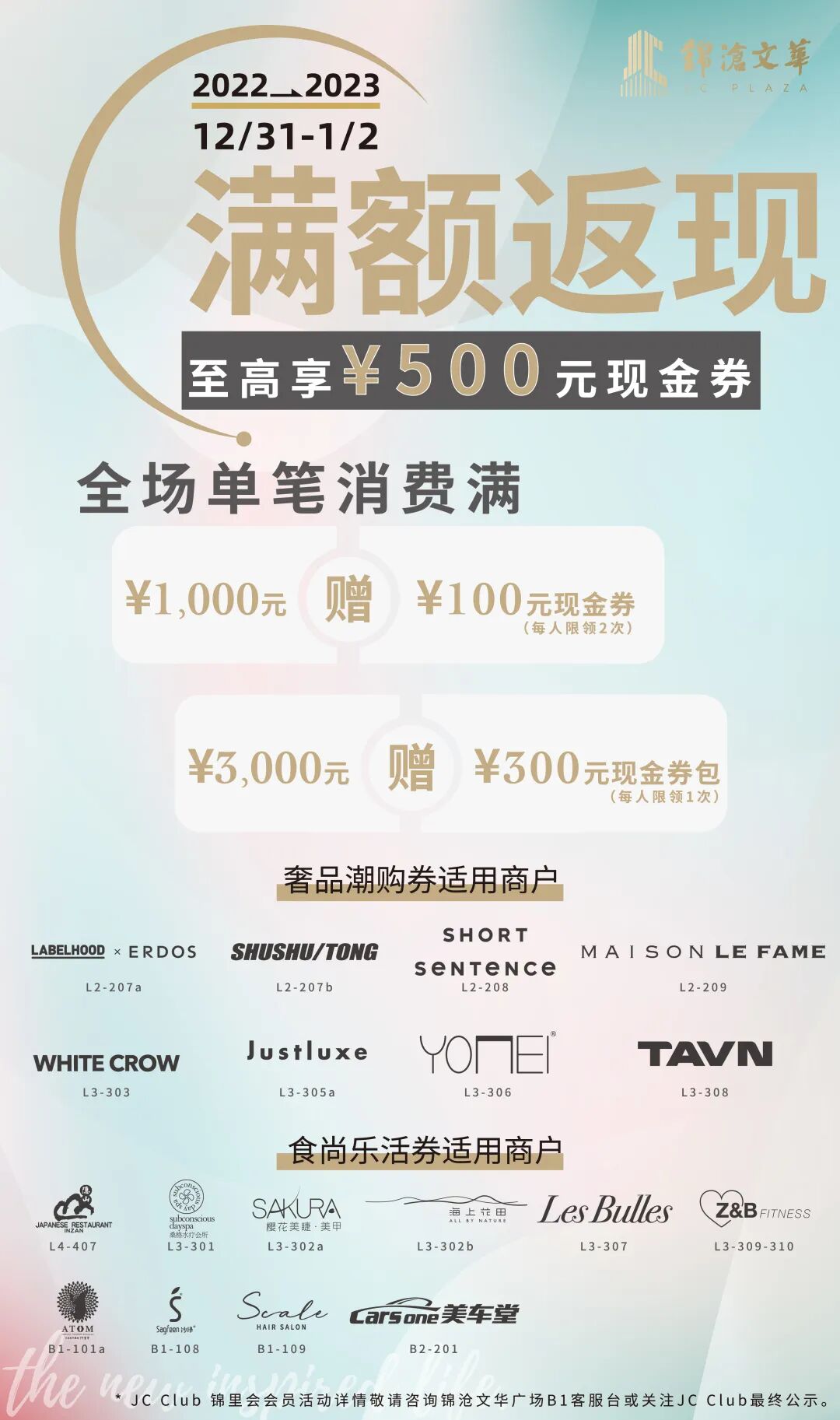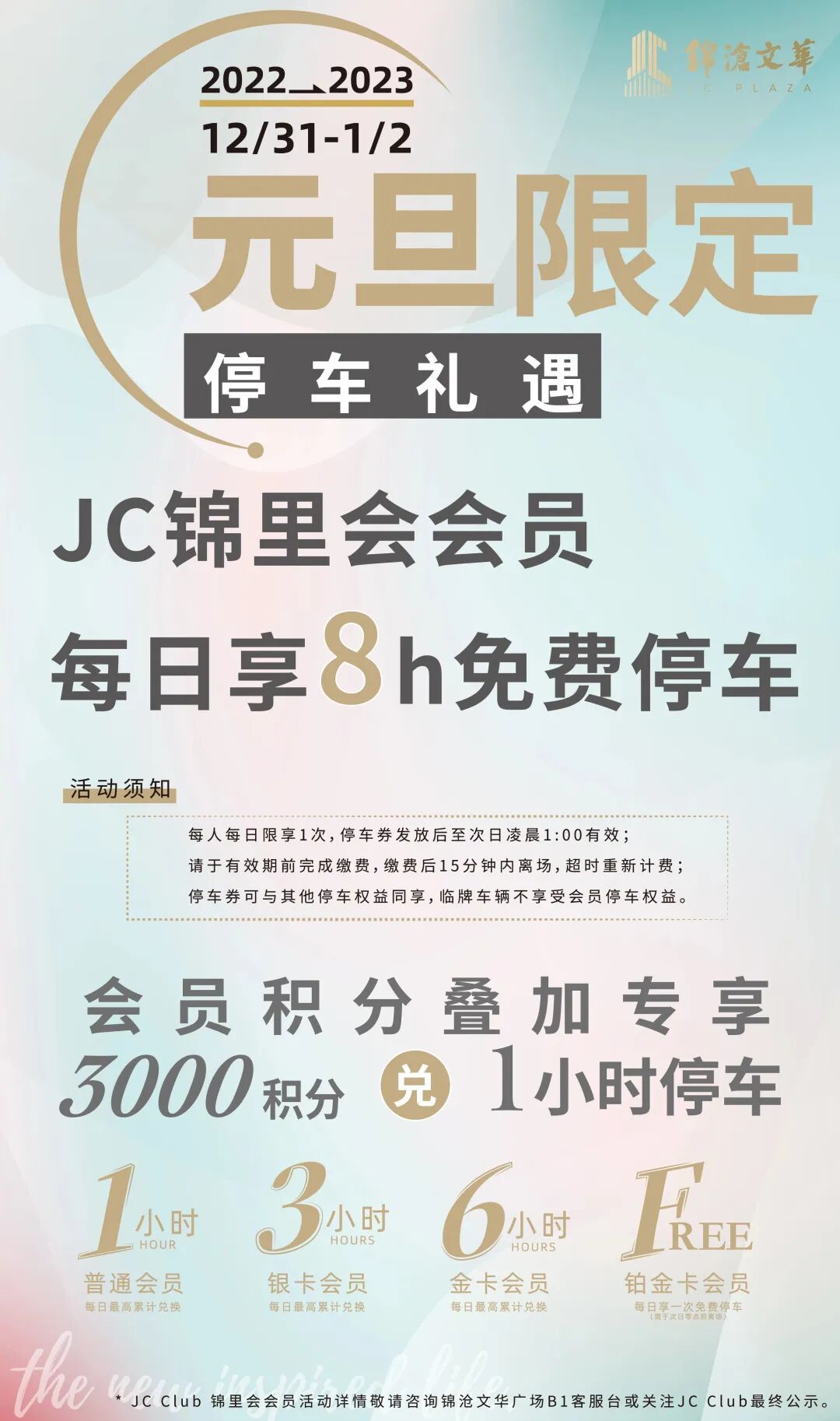 打卡精美节日装置,徜徉JC灵动世界,元旦假期期间,更有多重会员限定礼遇重磅来袭,年末焕新大作战,满额返现,幸运抽奖,多重福利玩不停!LaLa station1周年嘉年华狂欢继续,2023年1月1日起,LaLa station奇妙星球降临,萌兔驾到花LaLa星球,许下新年祈福心愿,与小花兔一起拥抱2023新世界。