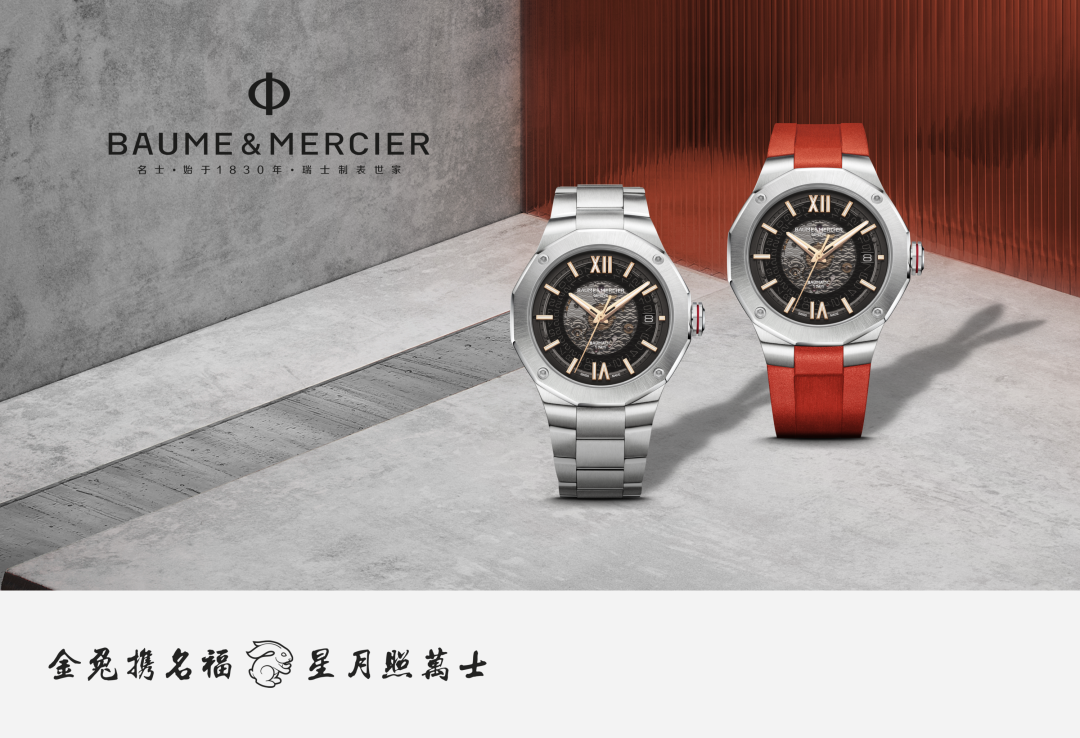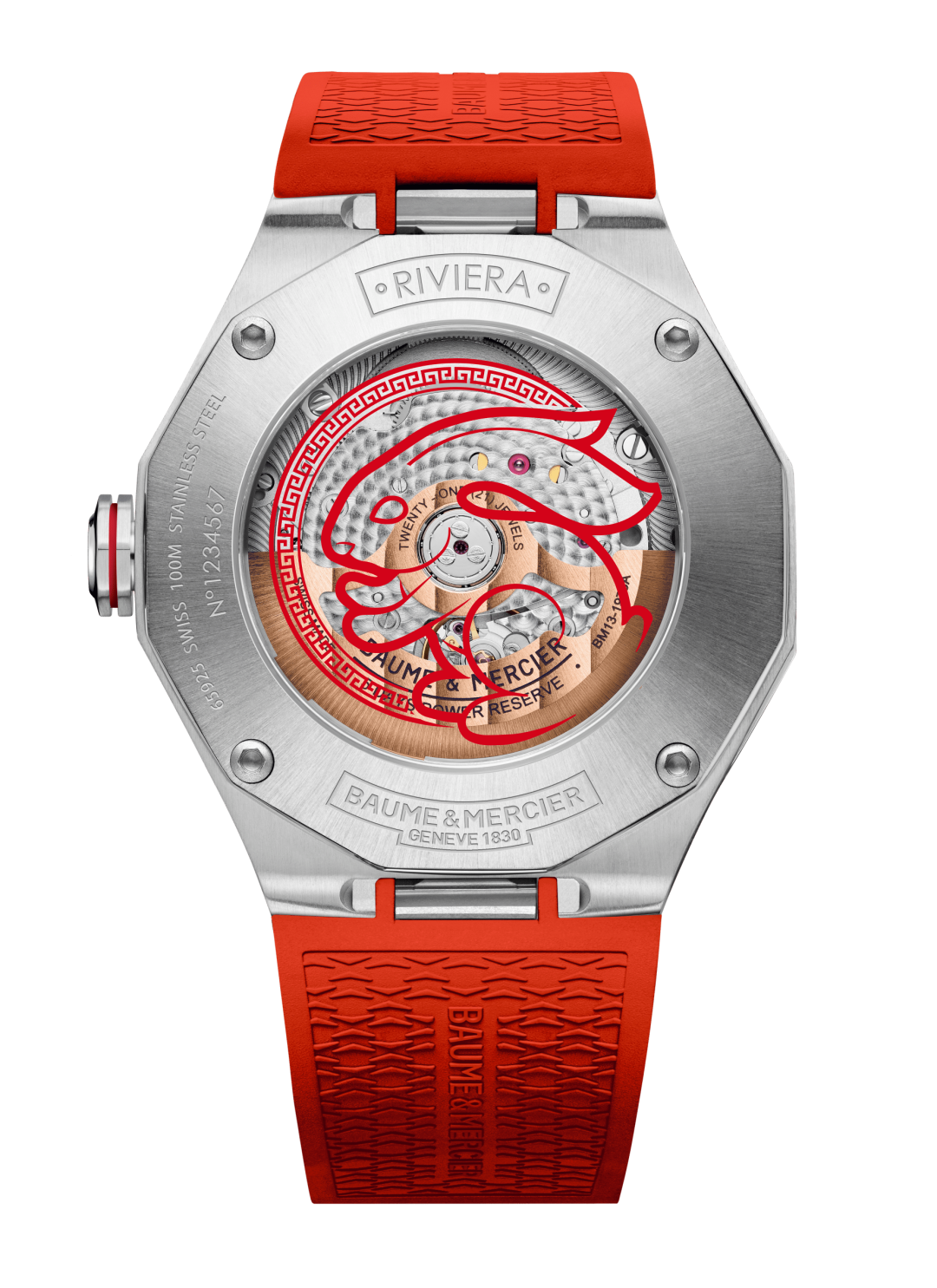 该系列以运动时尚的标志性设计特色,饰以中国传统中寓意能带来幸运、福气和财富的象征细节,喜迎新年,性能卓越的品牌自制Baumatic机芯驱动这枚满载“好运道”的兔年腕表。