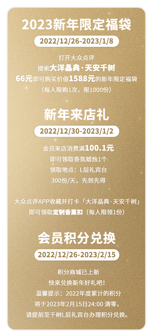 值得一提的是,大洋晶典·天安千树为我们准备了超多新年好礼,不仅有限定福袋,更有到店礼以及积分商城上新,多重福利等着我们来get!![]()