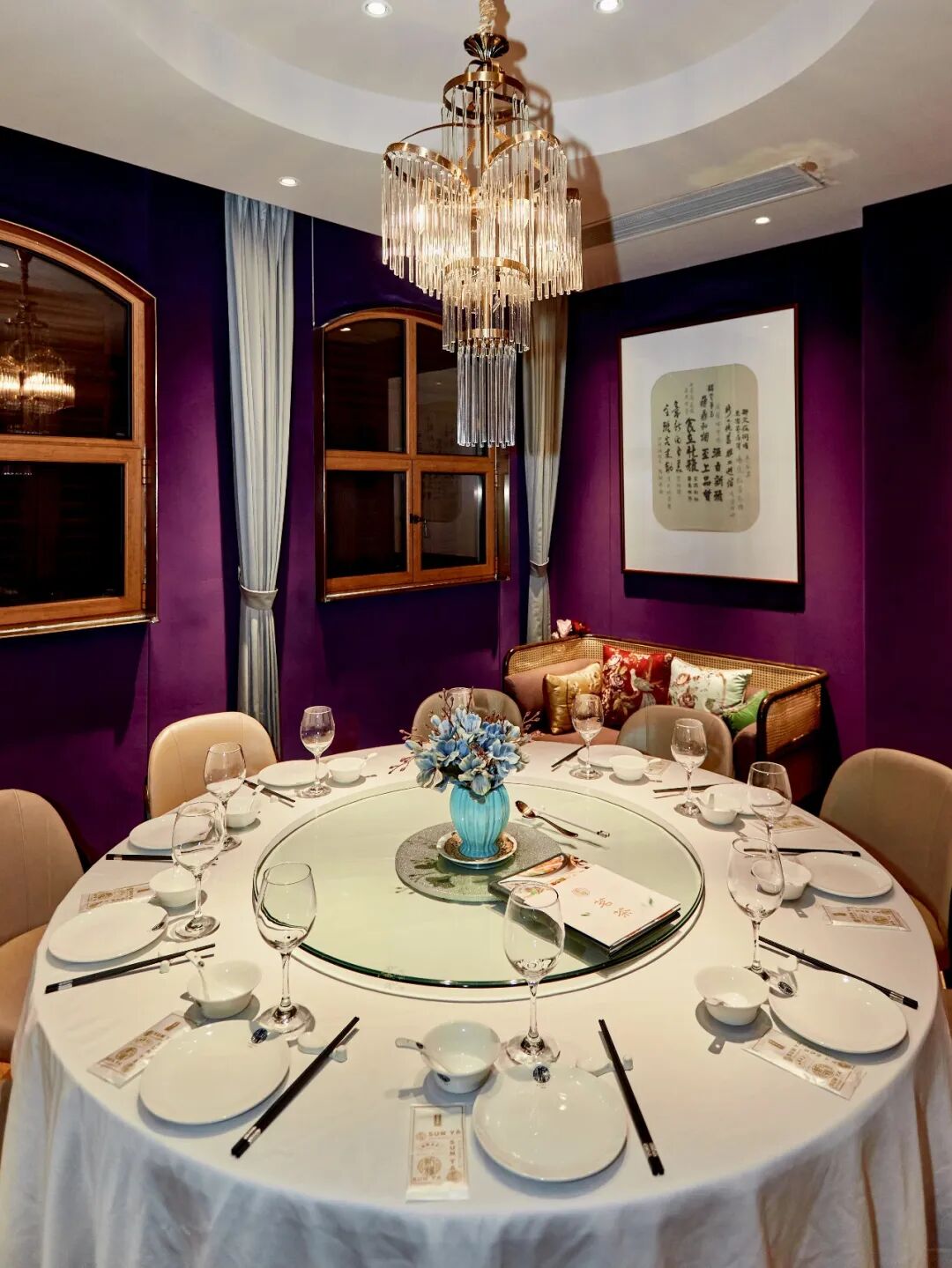 丰盛里店位于商场3楼,贵气的紫金色调西式硬装搭配中式软装,时尚又不失沉稳,精致的灯具,从大小到颜色都纷繁有序。