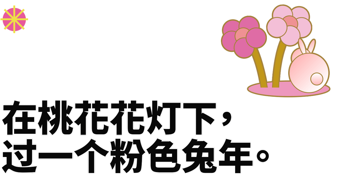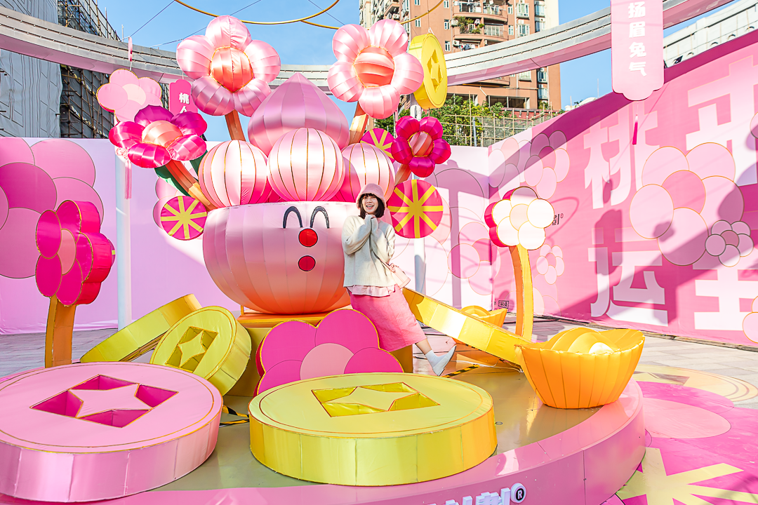 全场一共有8个兔年主题装置和整整100盏桃花花灯,每个主题装置都有不同的新年寓意。