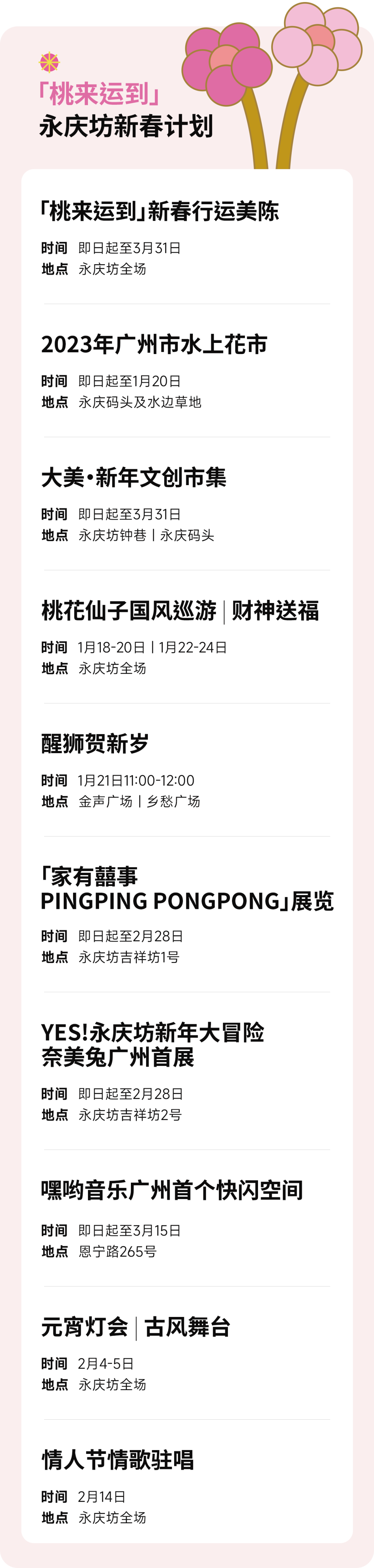 兔年即将到来,春节去永庆坊的桃花花灯下,许新年愿望;在荔湾湖边重温热闹的传统西关年、体验一次新奇过年仪式;年后再参加一场浪漫的元宵灯会、过个粉色情人节。
