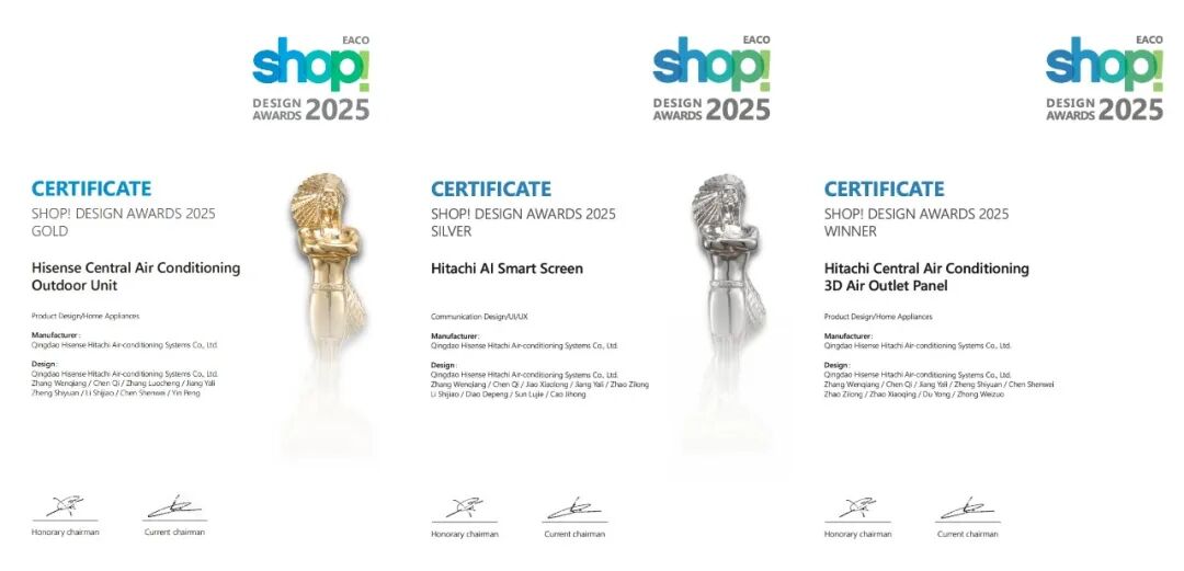近日,2025年度SHOP!国际设计大奖(SHOP! Design Awards)获奖名单正式公布。海信中央空调侧出风室外机荣膺2025年度SHOP!国际设计大奖最高荣誉——金奖,设计美学与卓越性能赢得国际认可;日立AI智慧大屏凭借对科技功能和空间美学的深度平衡,荣获2025年度SHOP!大奖银奖,日立3D出风面板打破传统出风口的平面形态,实现从“功能组件”到“空间美学元素”的跨越,荣获2025年度SHOP!大奖Winner奖。