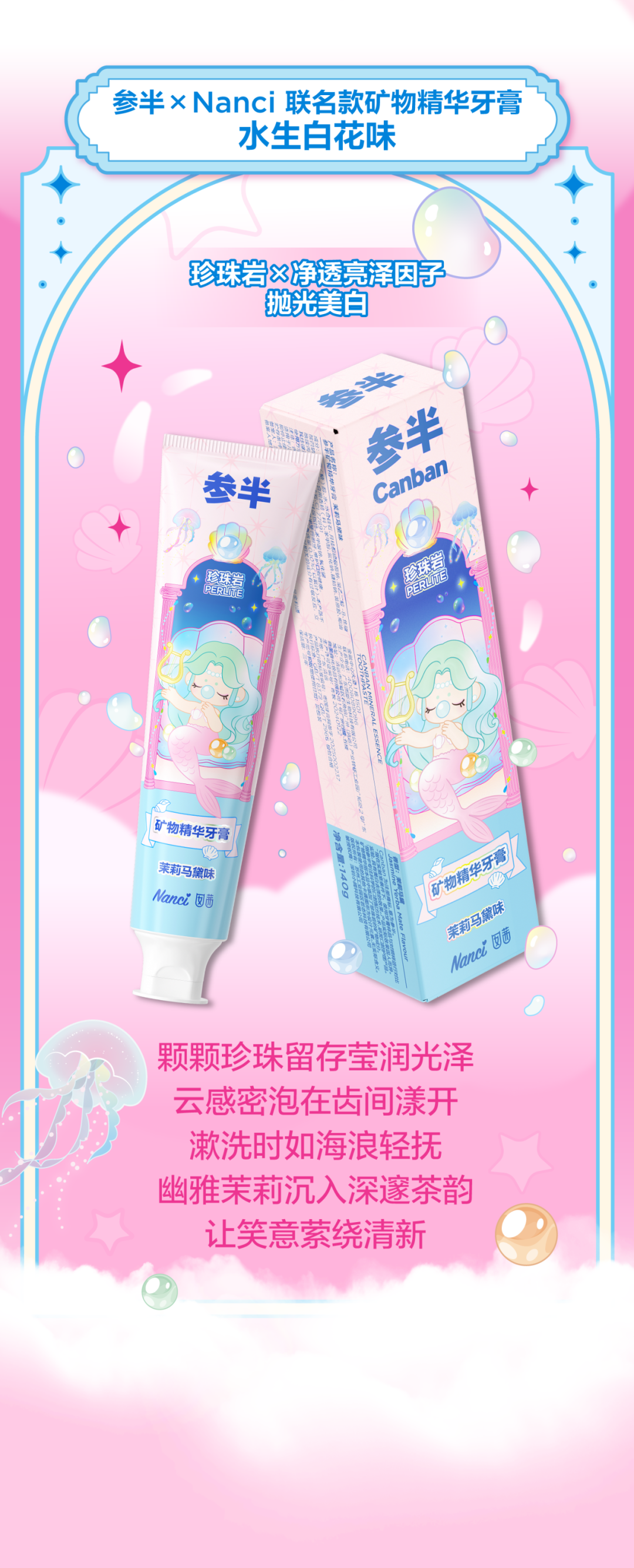 推荐:「点击切换后展开」与Nanci联名推出“浮光映珠”系列牙膏,主打矿物精华与美白功能,吸引读者前往购买。